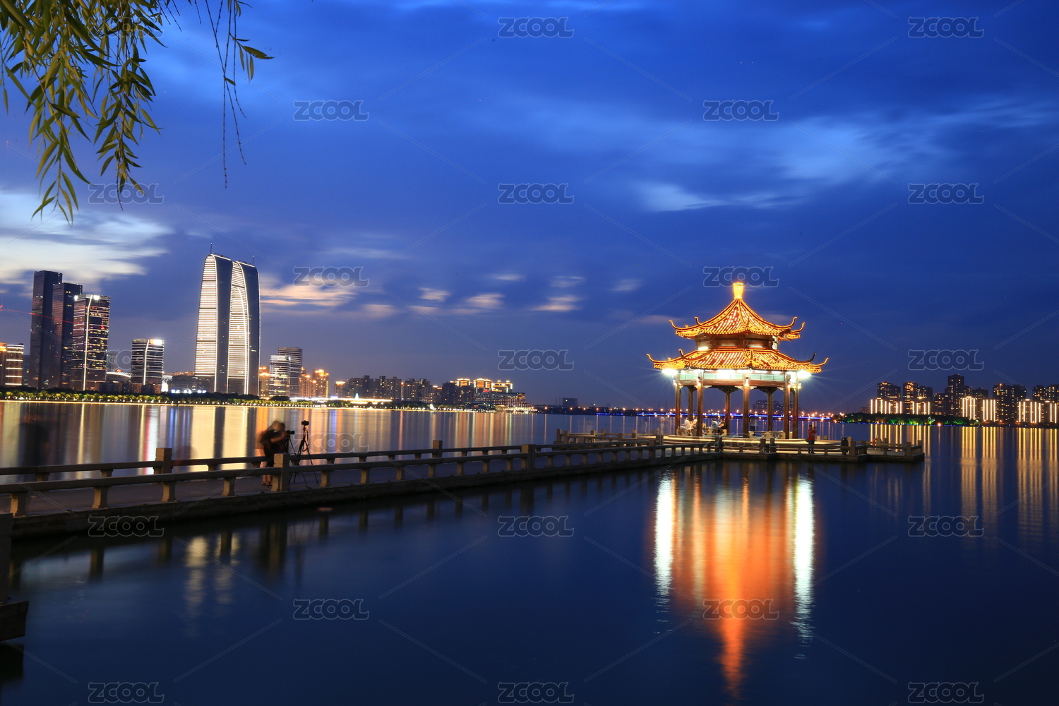 中国江苏苏州金鸡湖李公堤湖心亭夜景