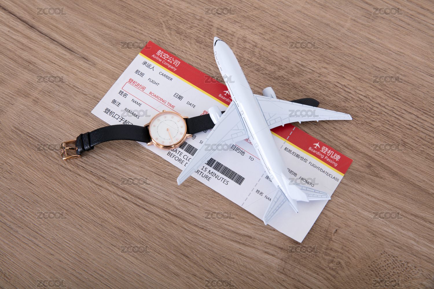 飞机模型和登机牌及一个手表