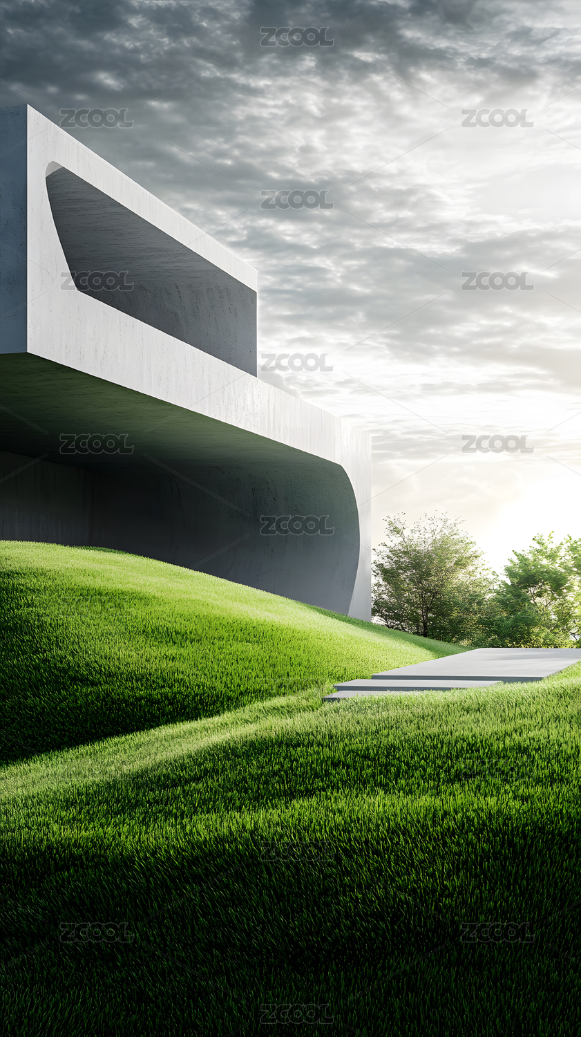 现代建筑与绿色草地景观