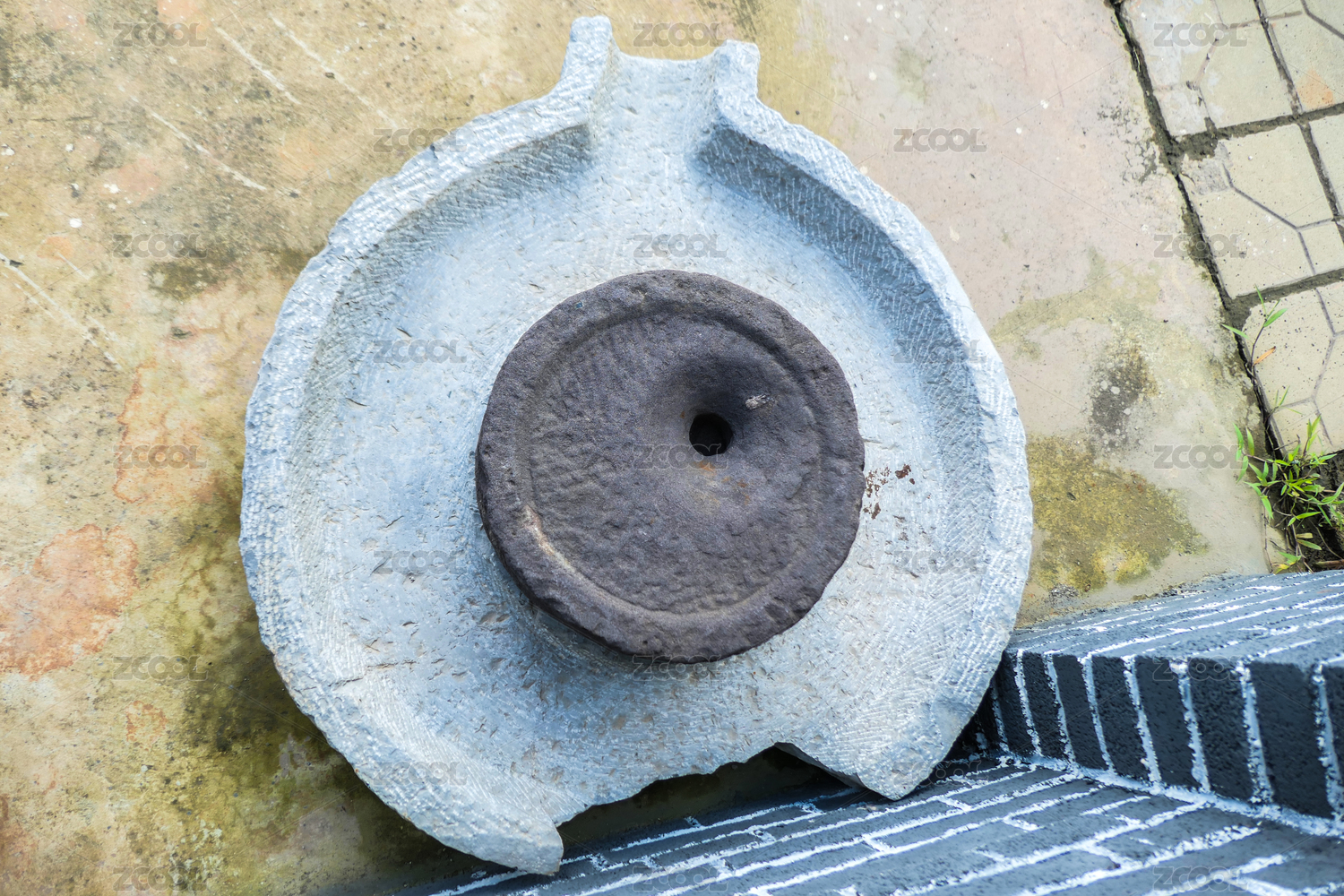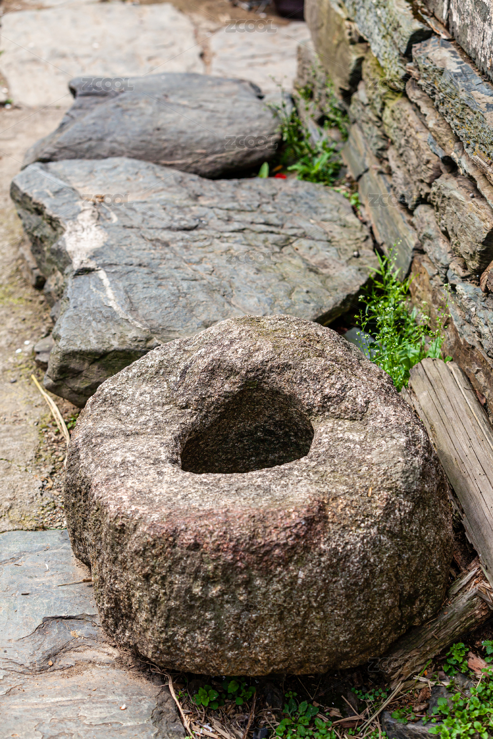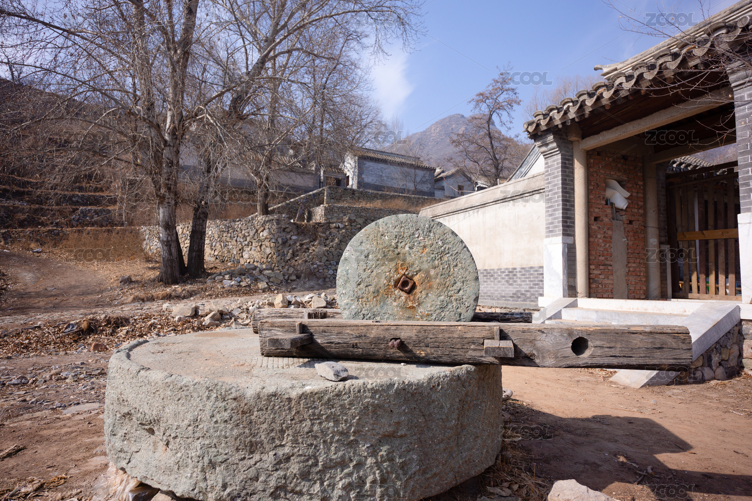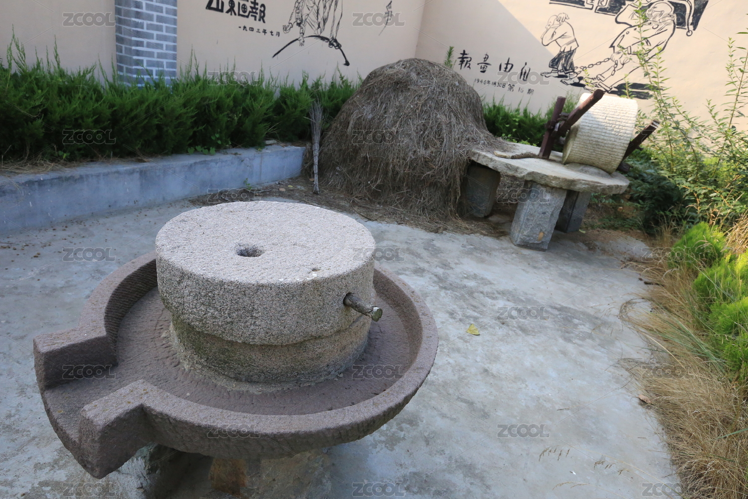 中国山东省临沂市沂蒙红色影视基地内沂蒙山村的石碾子