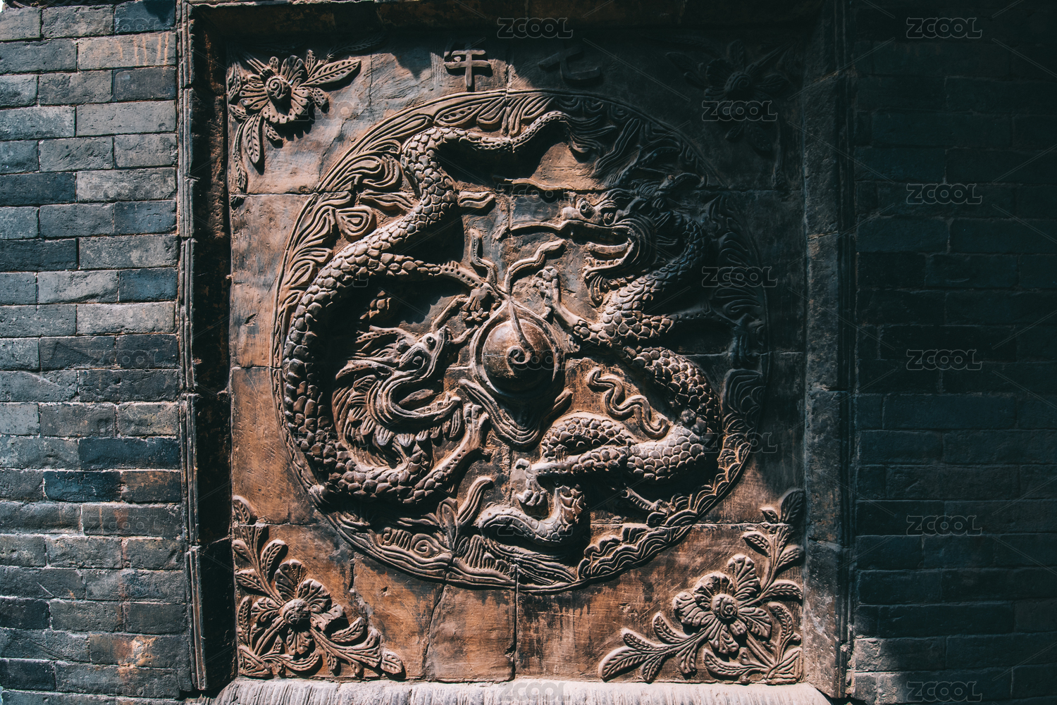 中国山西晋中平遥古城二郎庙二龙戏珠砖雕