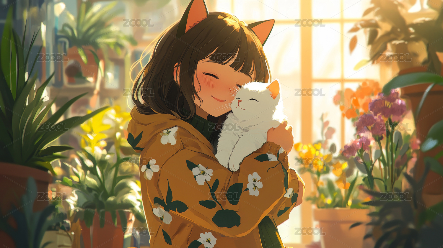 夏天庭院里女孩和大猫在睡觉治愈温馨场景