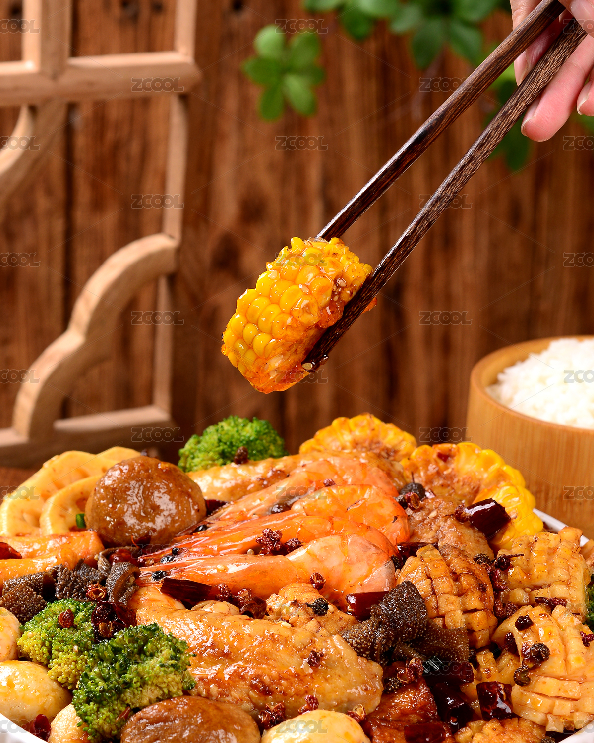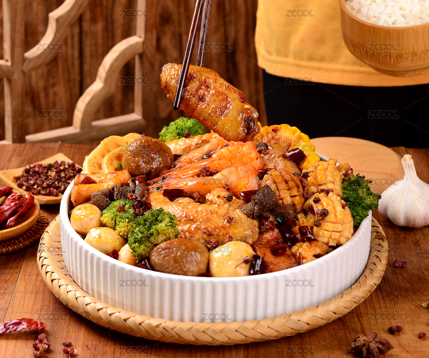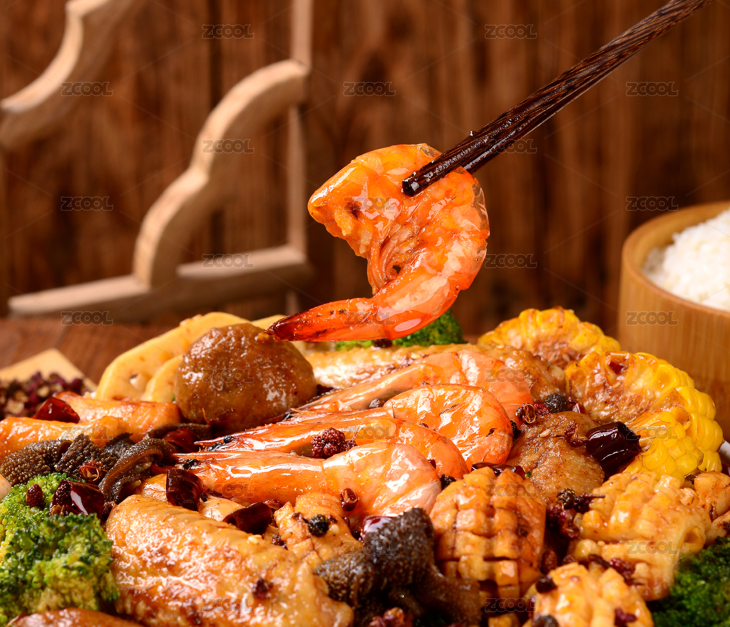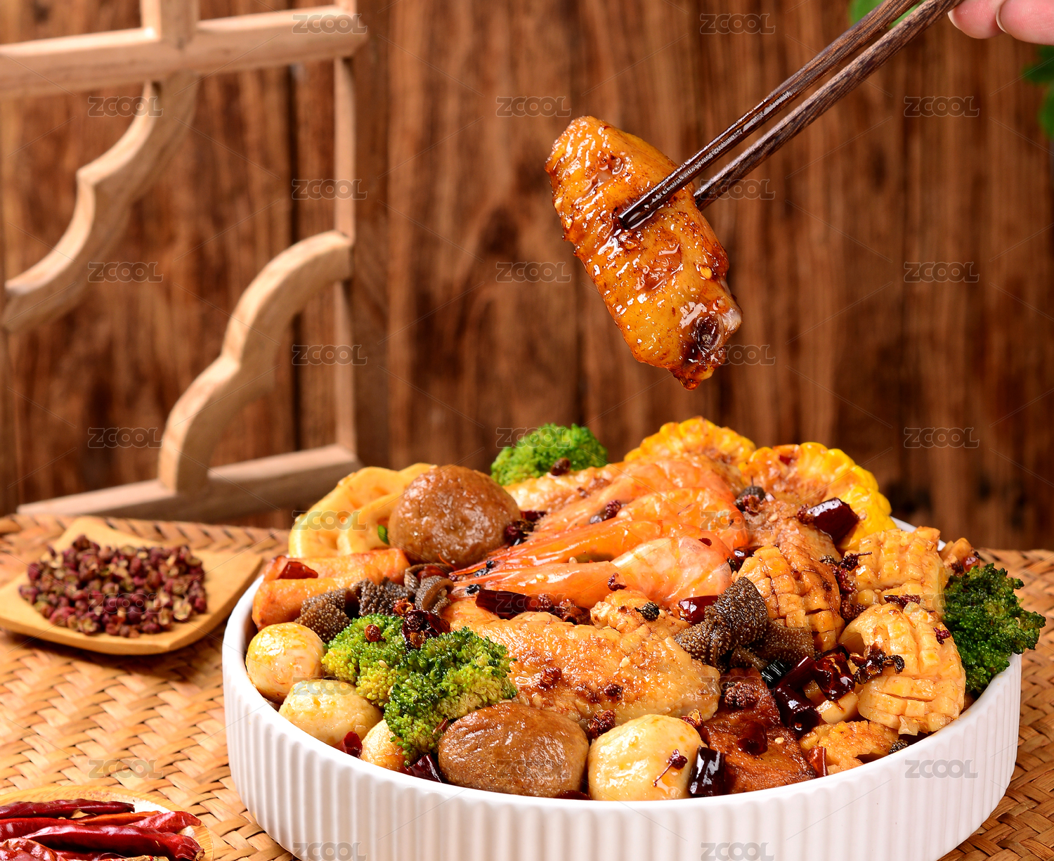 麻辣香锅,干锅冒菜,冒菜,红油冒菜,北极虾,西蓝花,鹌鹑蛋,鱿鱼花,海鲜,麻辣