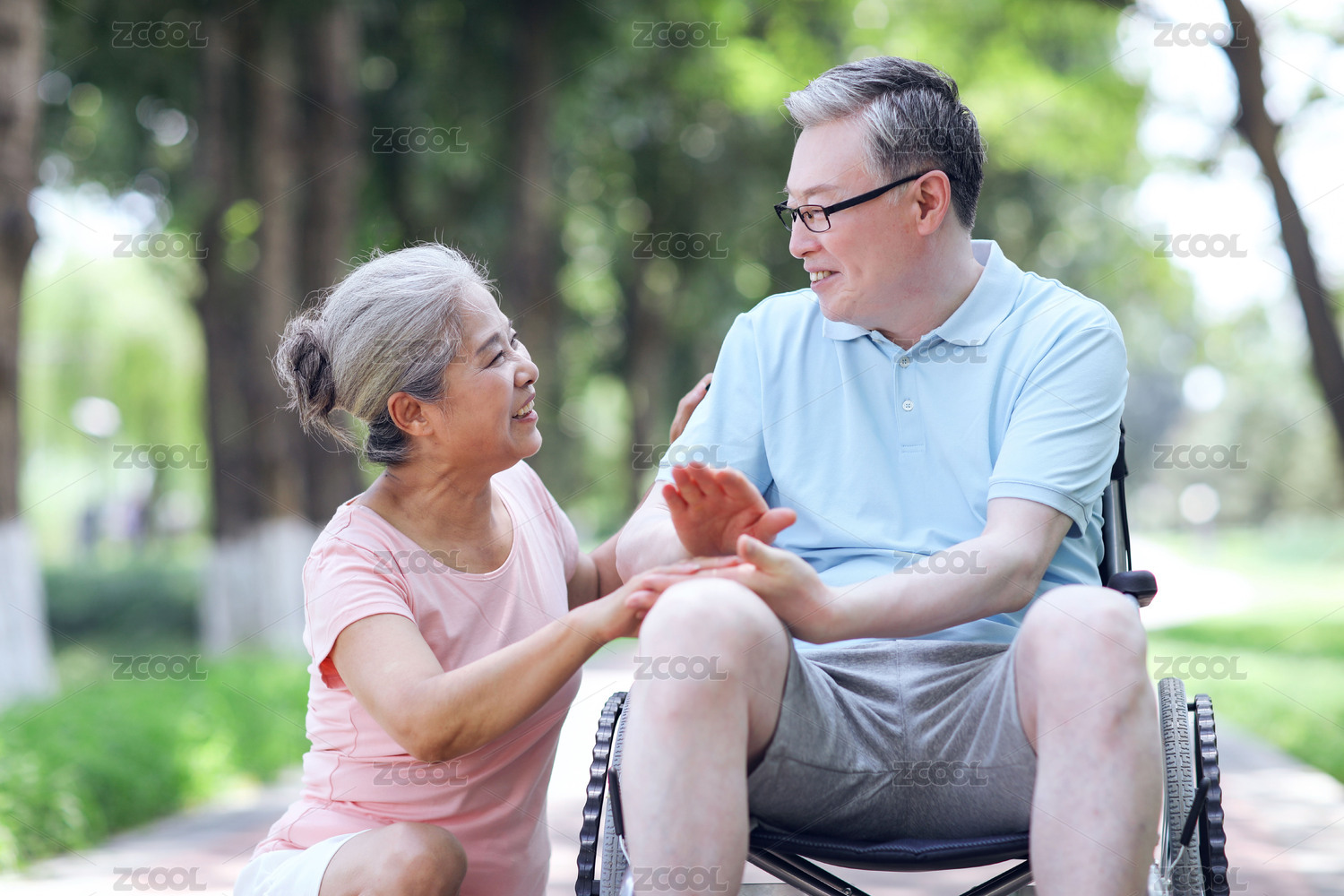 老年人推着坐轮椅的老伴