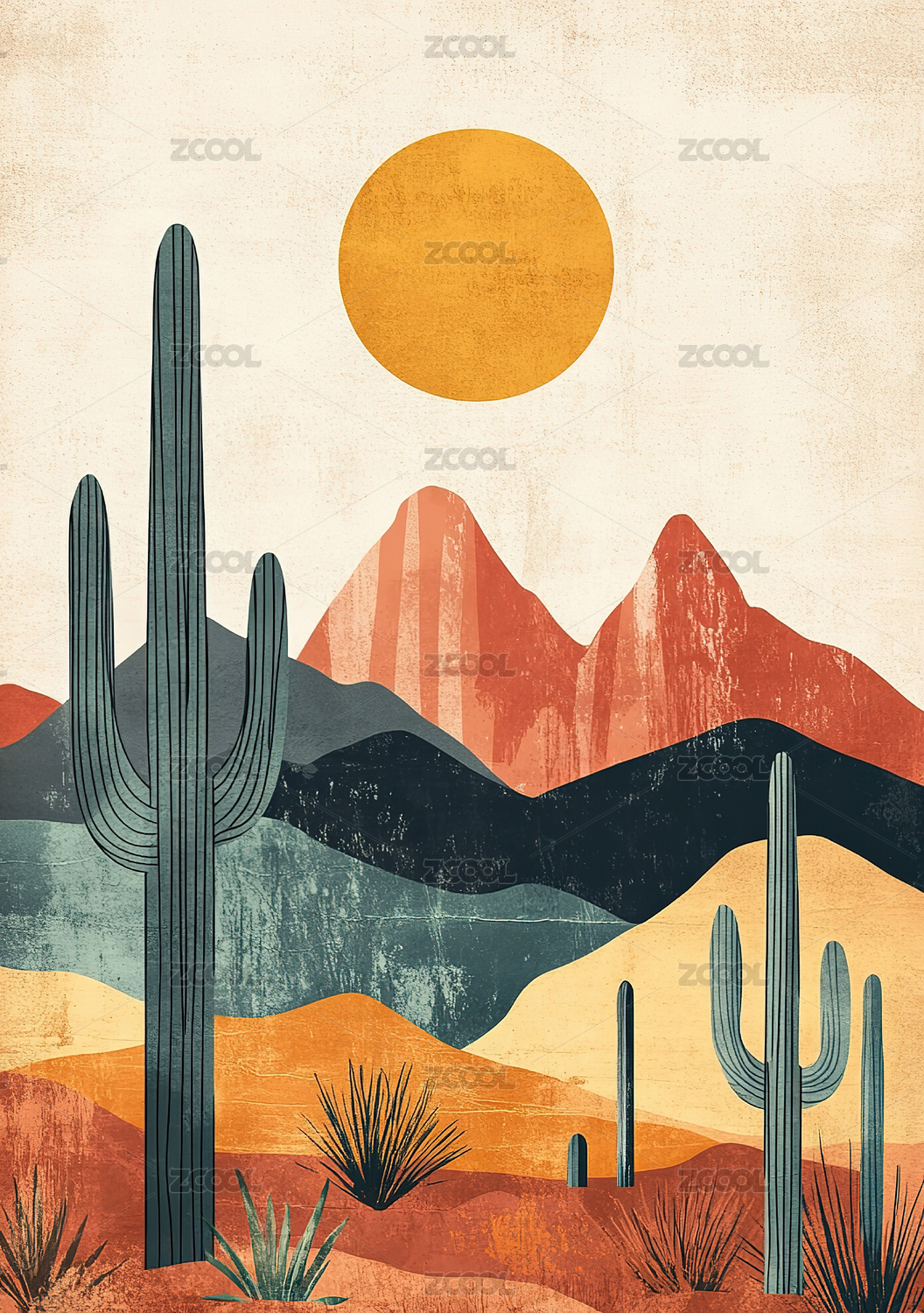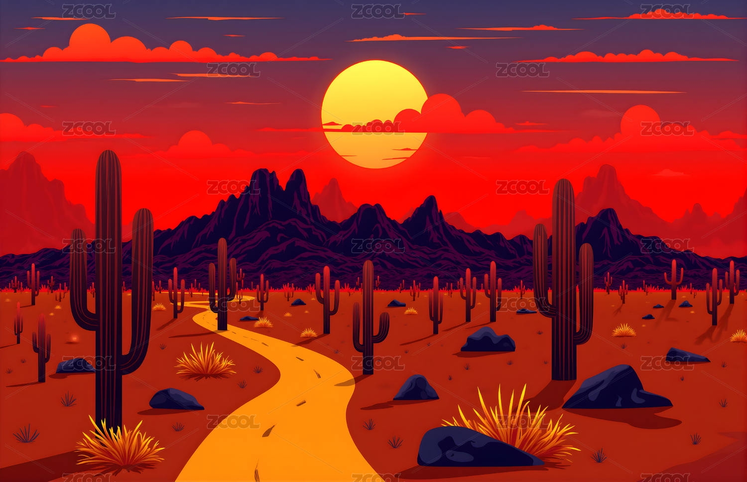 风格化沙漠日落与仙人掌和山脉