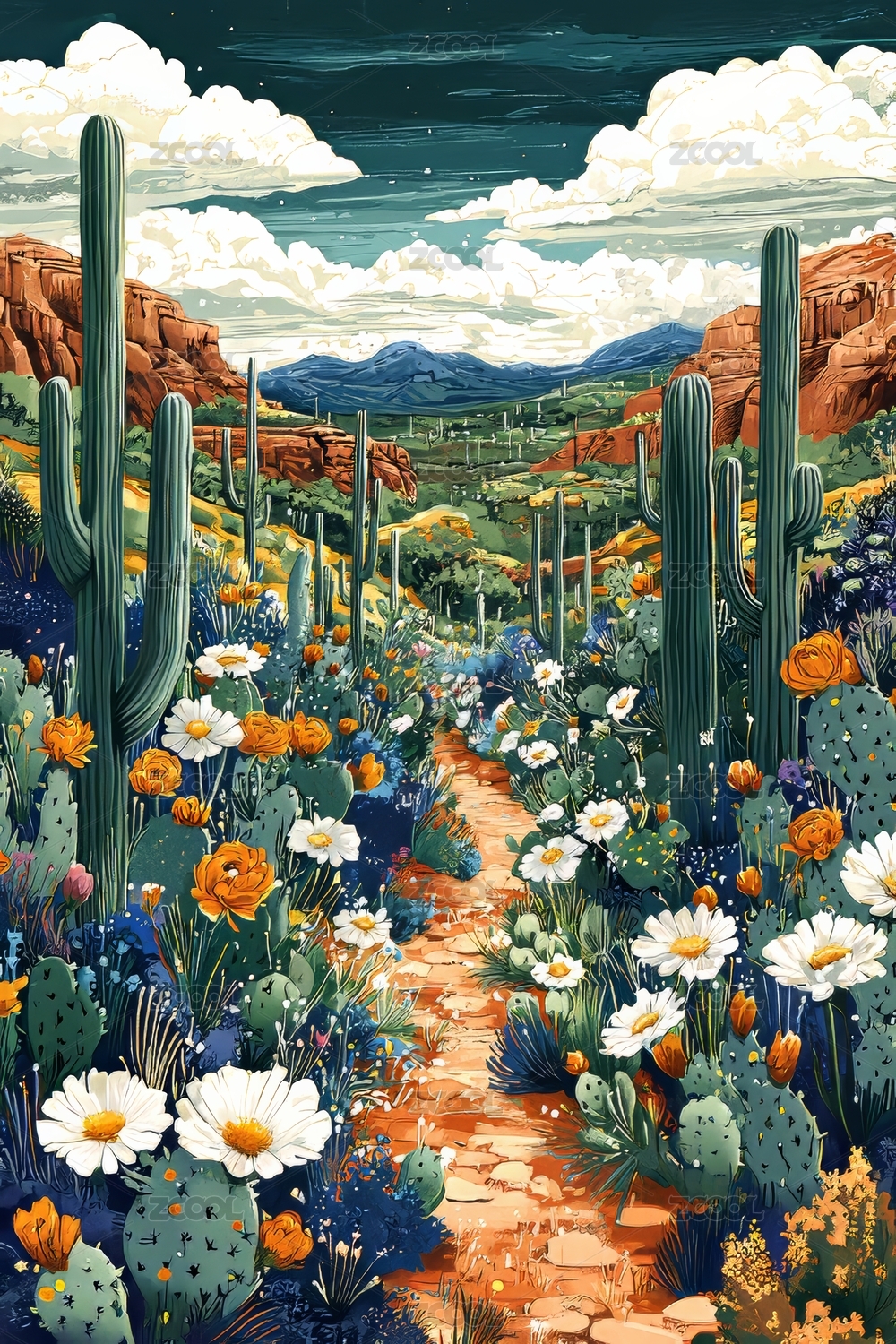 花海与仙人掌点缀的自然景观
