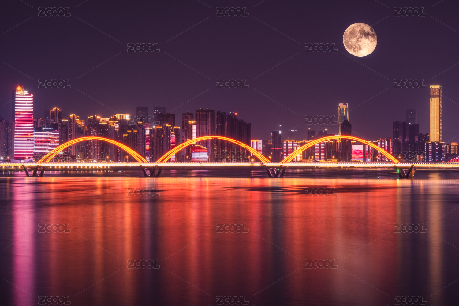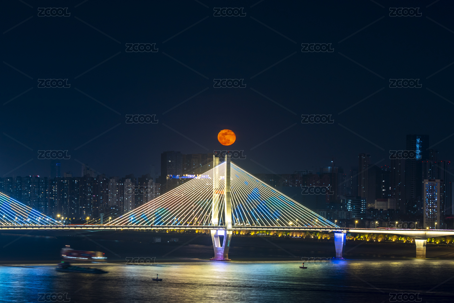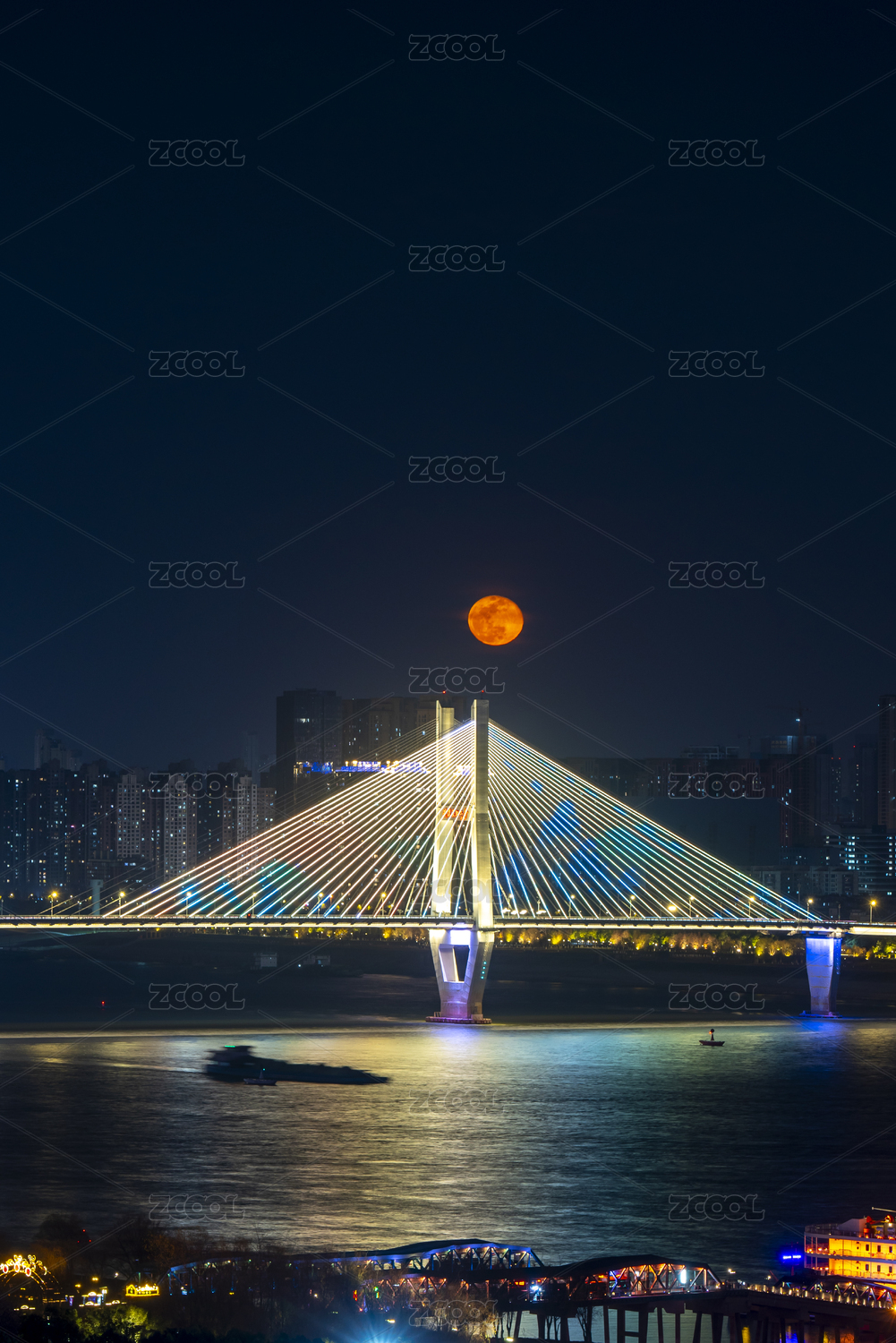 中国湖北武汉地标黄鹤楼长江大桥与中秋圆月