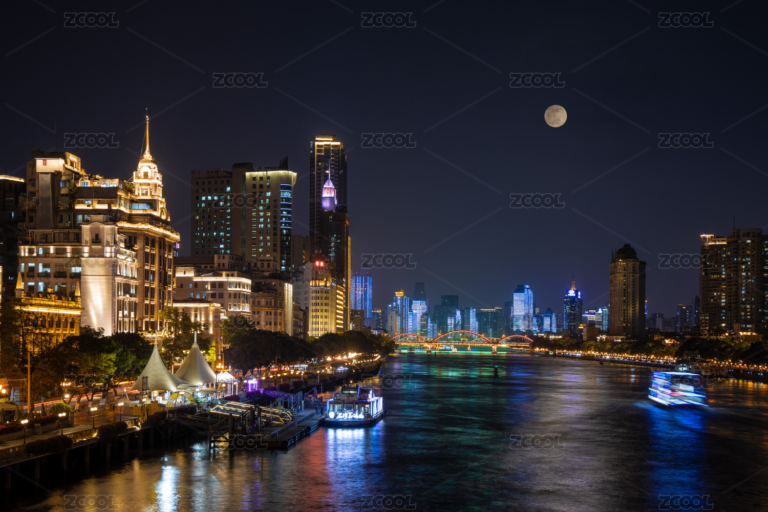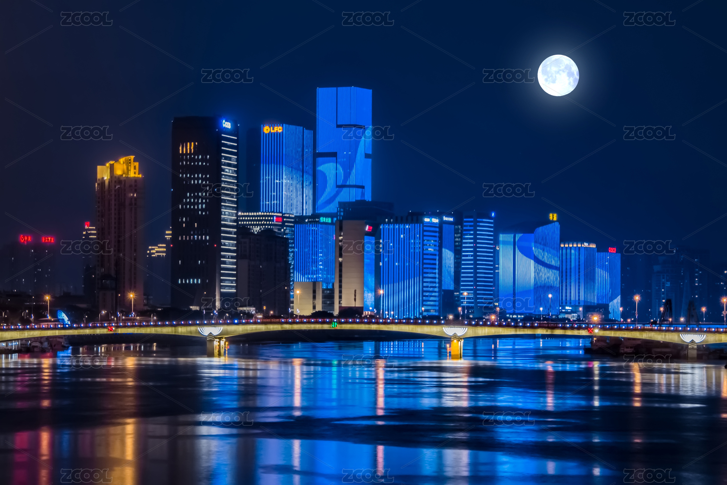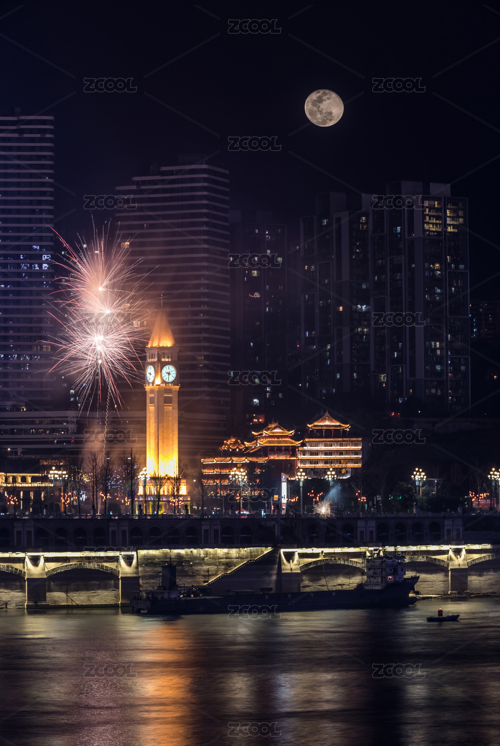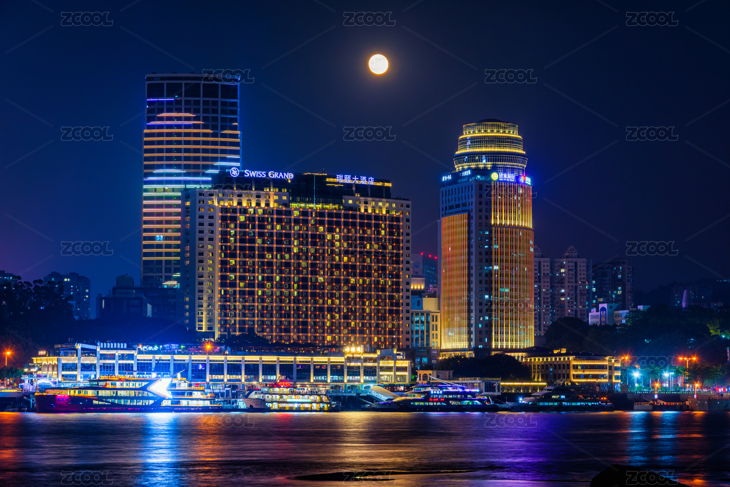 重庆市嘉陵江外滩夜晚月亮光照高楼建筑