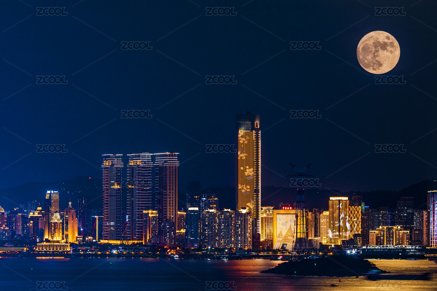 福建省福州市夜晚月亮光照闽江外滩高楼建