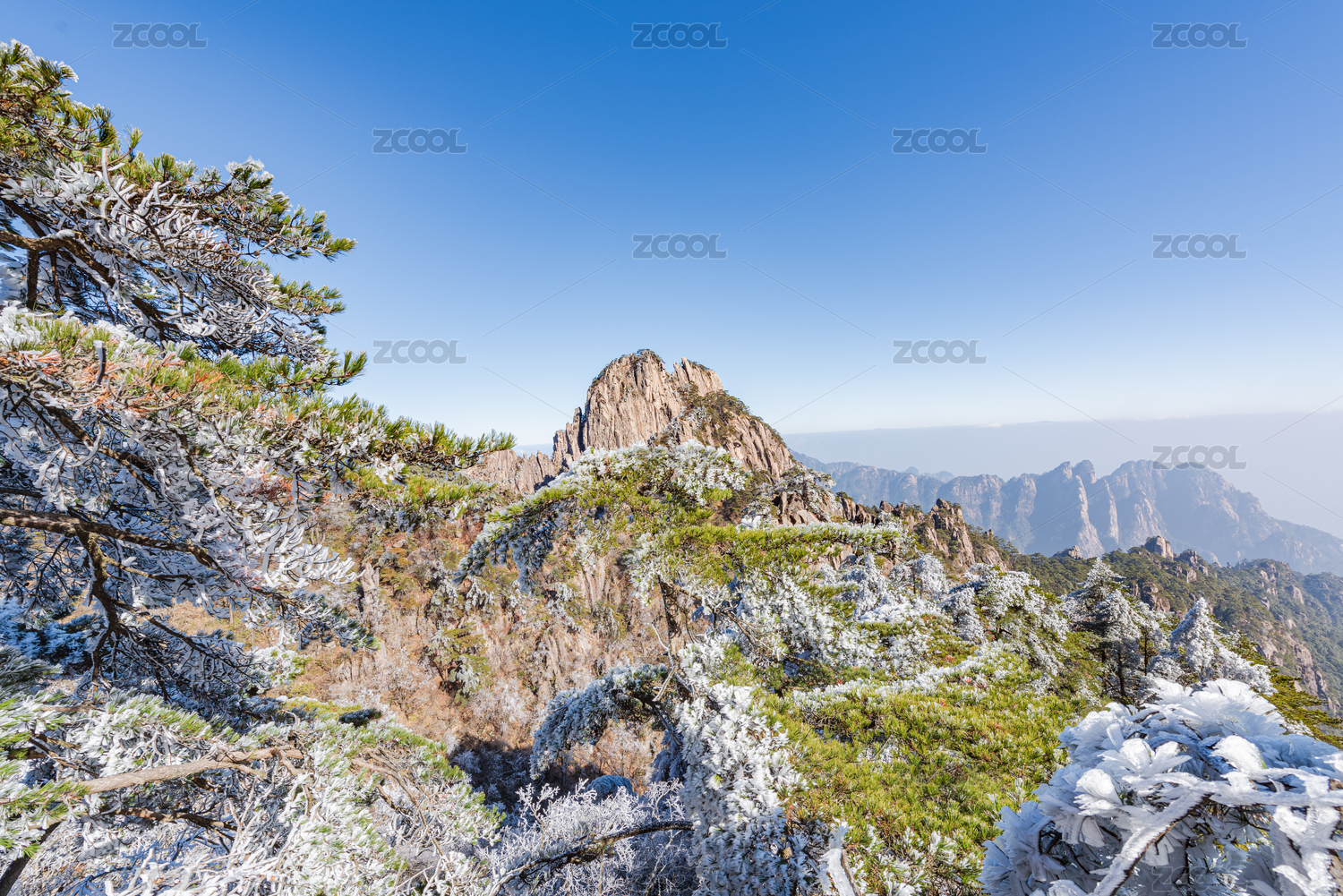 中国安徽黄山风景区晴天雾凇景观