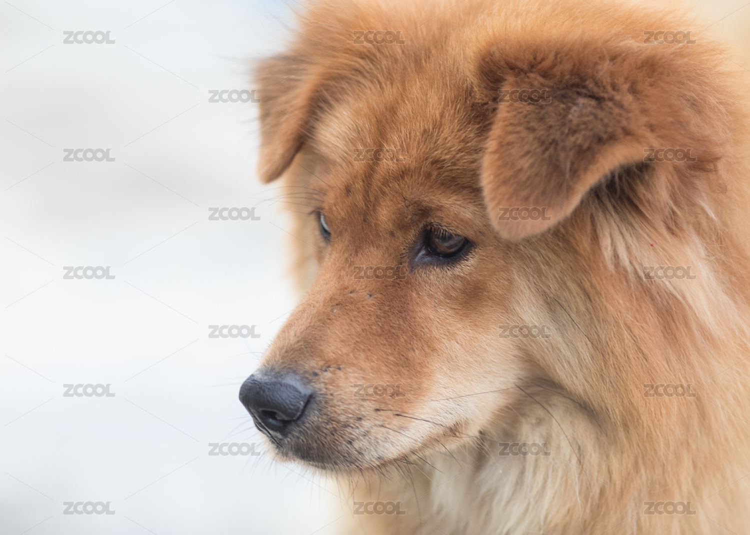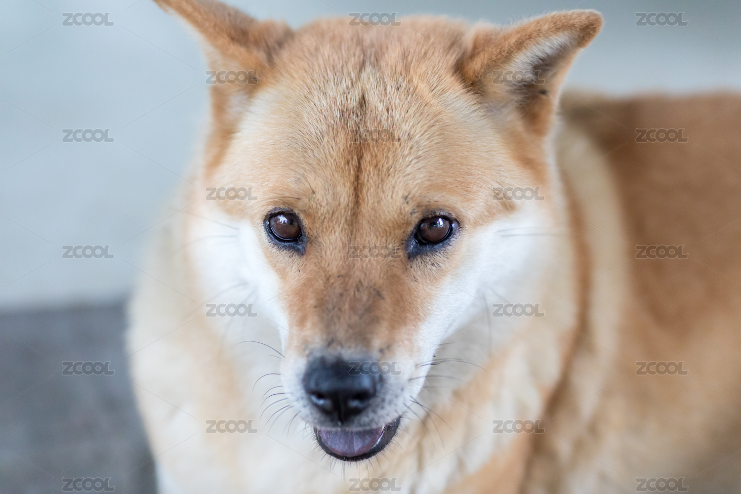 一只形似狐狸的黄色大狗吐舌头的面部特写