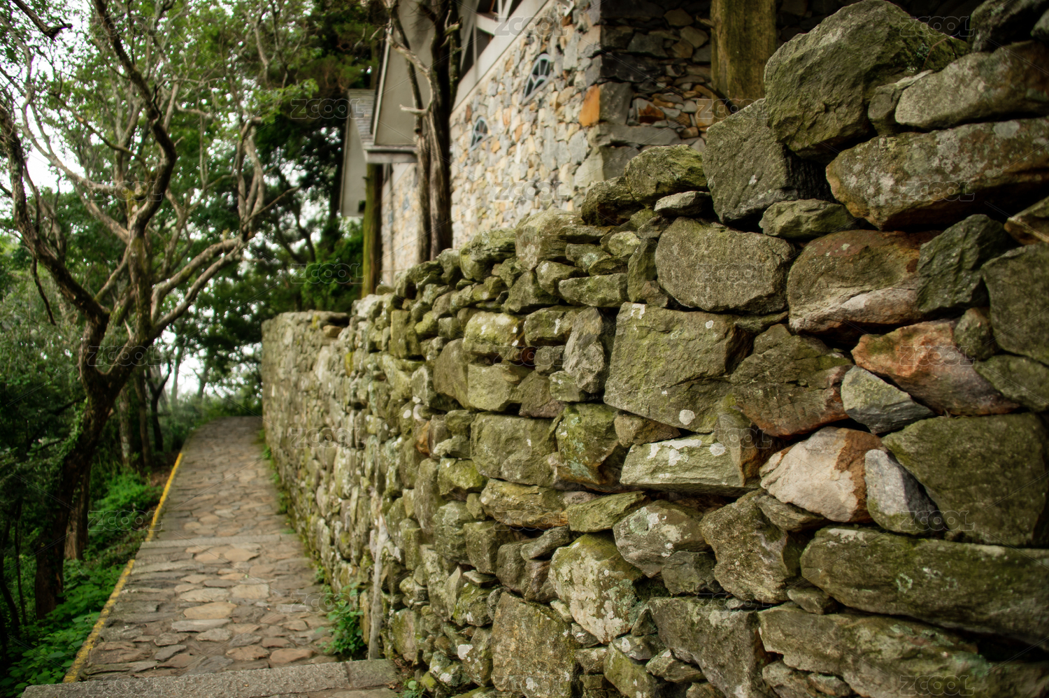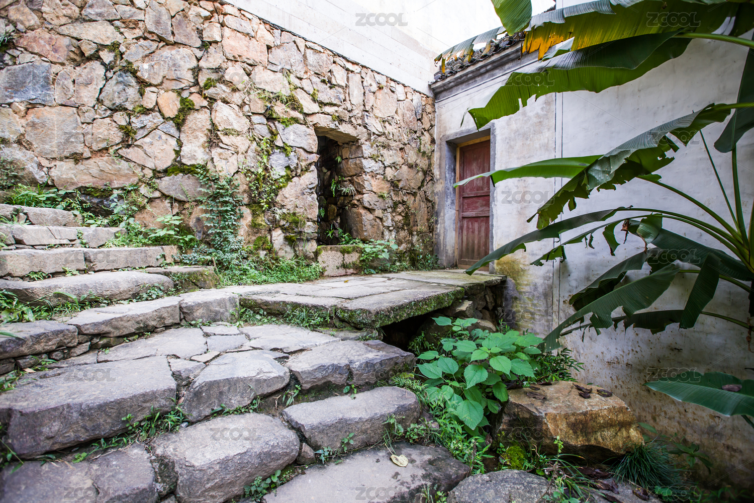 竹林绿色植物中有台阶延伸铺满石块的小路