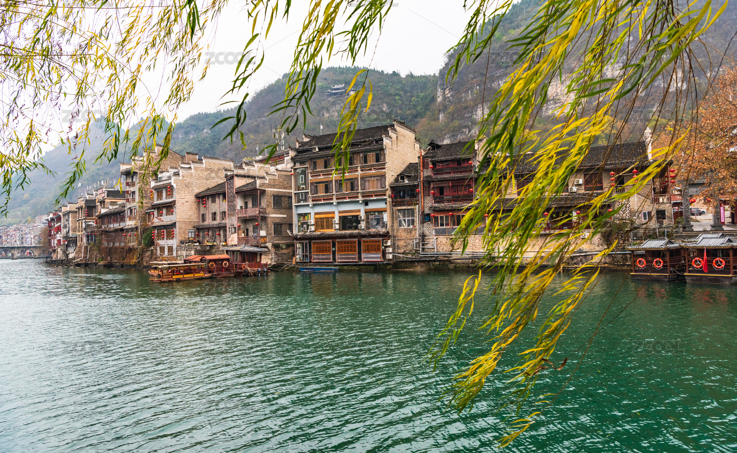中国湖南湘西凤凰古城沱江边上的吊脚楼