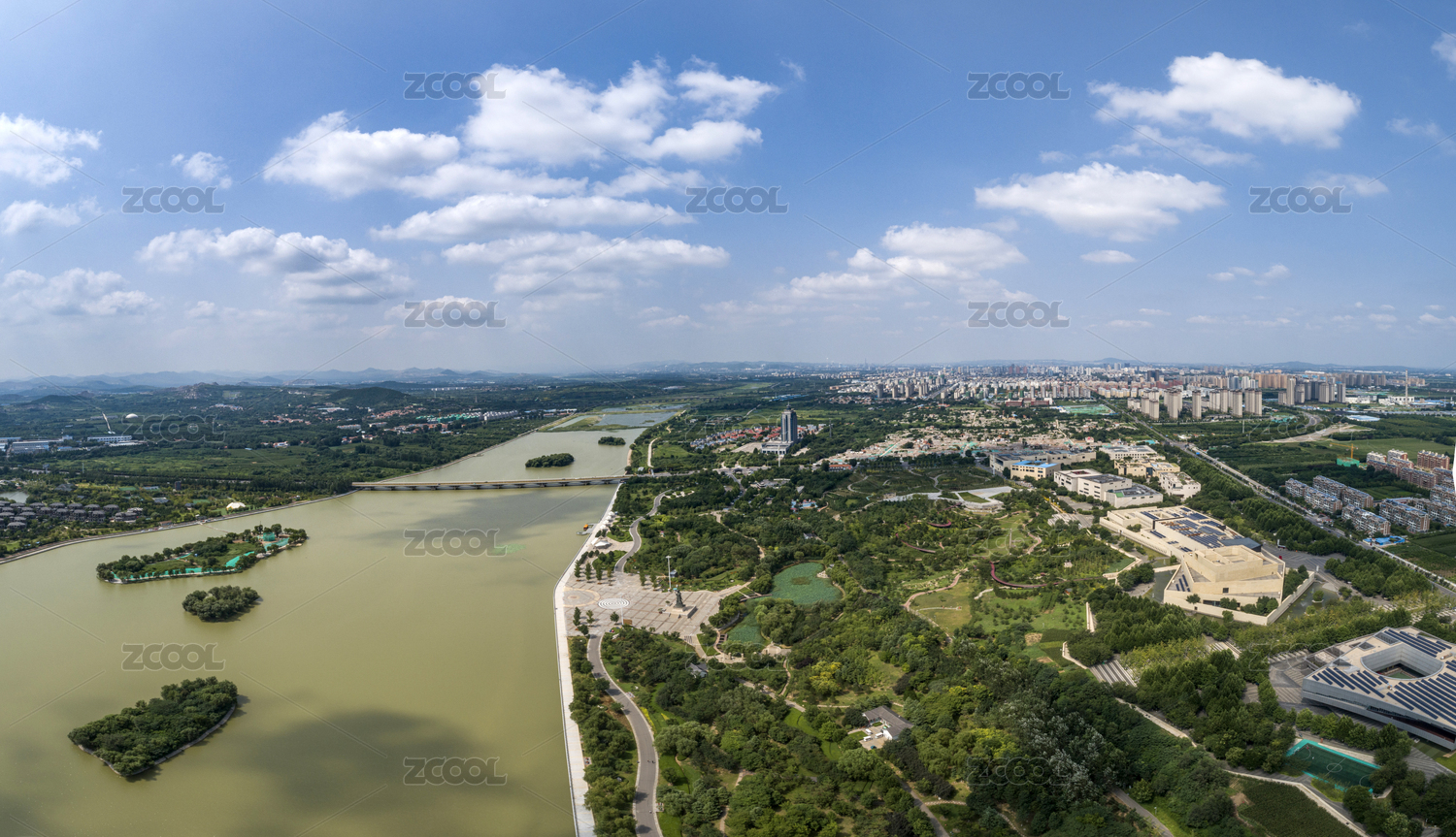 航拍河南郑州象湖生态湿地公园及贾鲁河水系