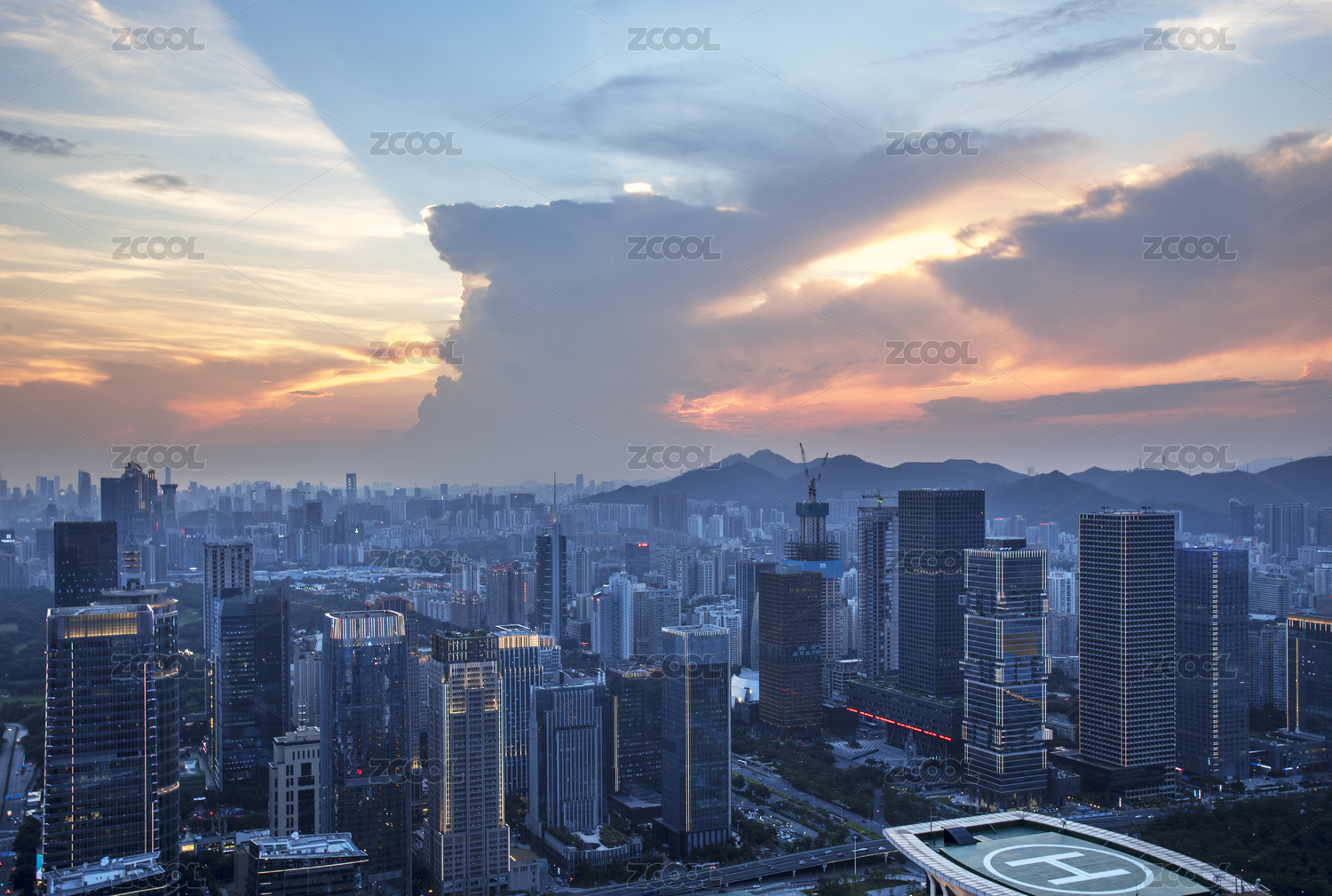 傍晚鸟瞰中国深圳城市天际线建筑群高楼大厦风光