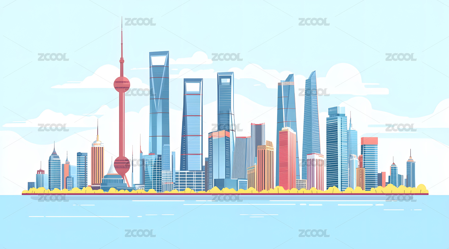 蓝色调都市天际线,摩天大楼与现代建筑群