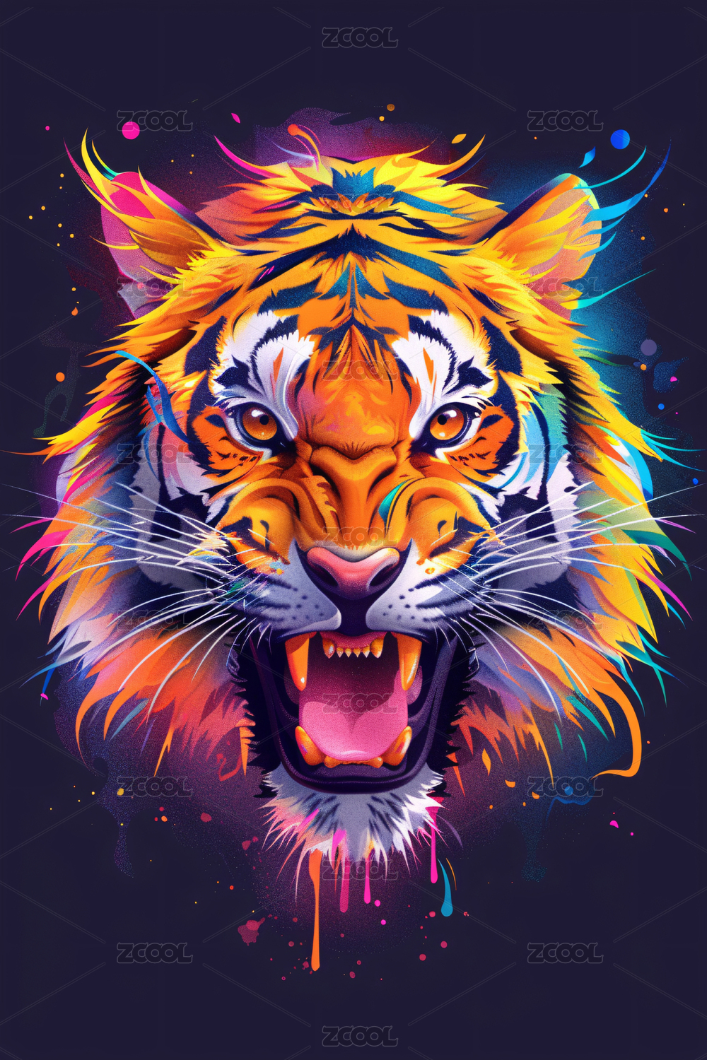 复古美式怒目圆睁咆哮的老虎头像装饰插画