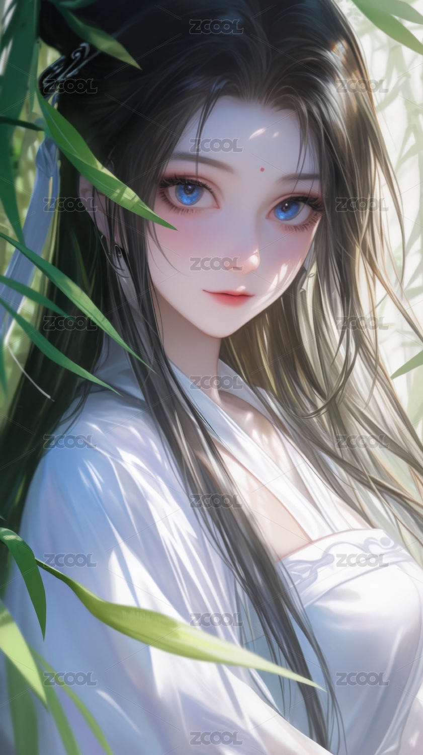 古风女子青丝白衣竹影相伴