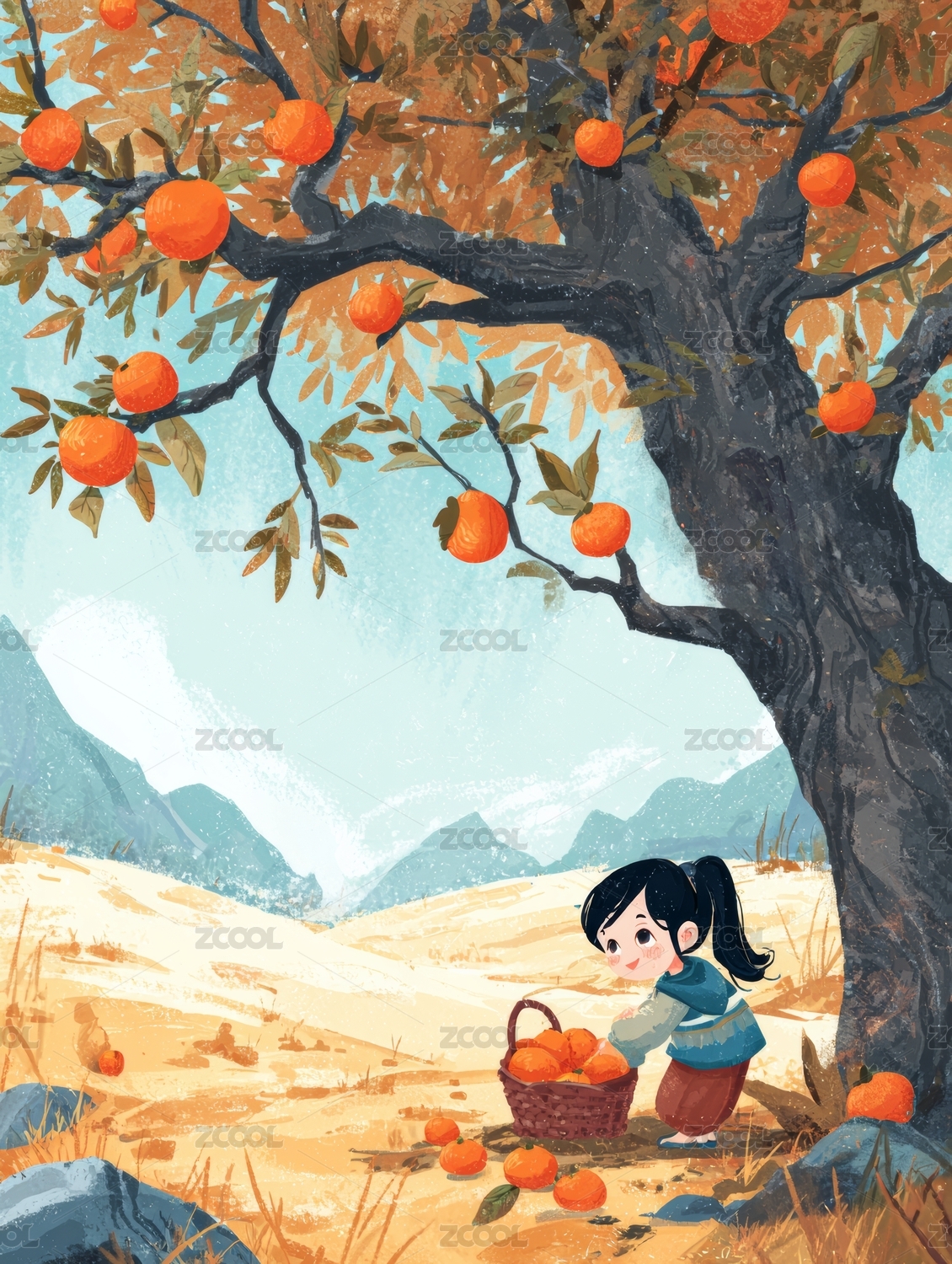 二十四节气寒露秋天枝头挂满柿子树下文人画