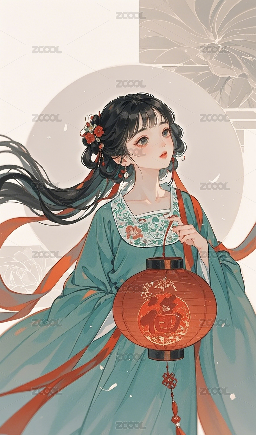 AIGC202403,中秋插画,嫦娥,玉兔,月亮,云朵,中国风,古风,国潮,灯笼