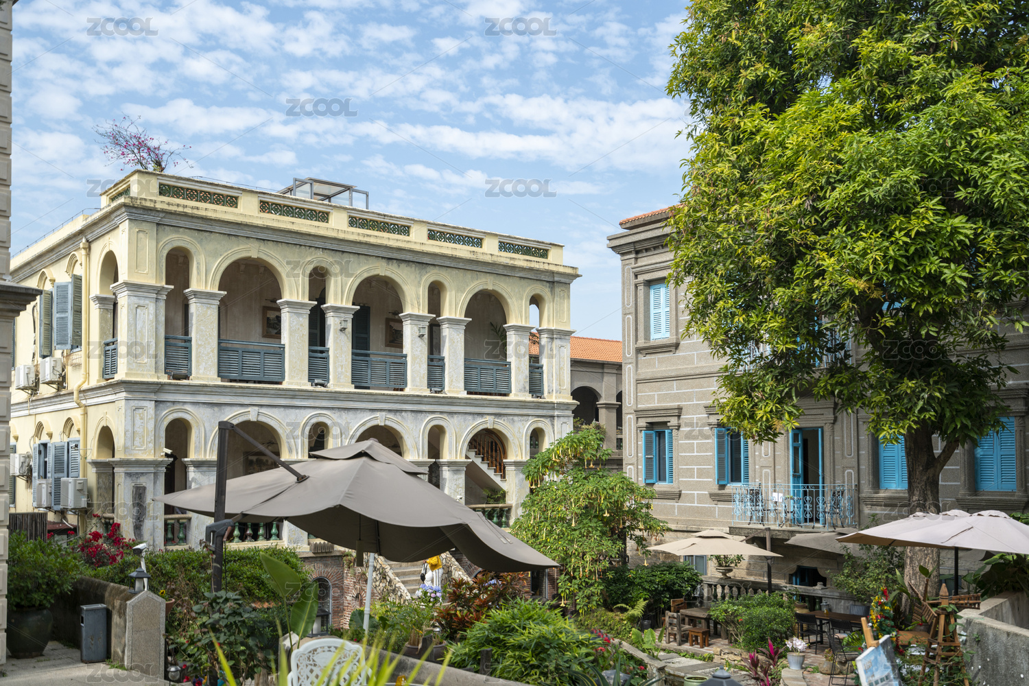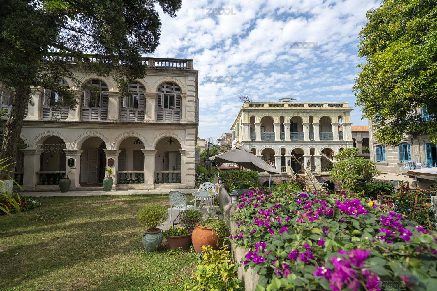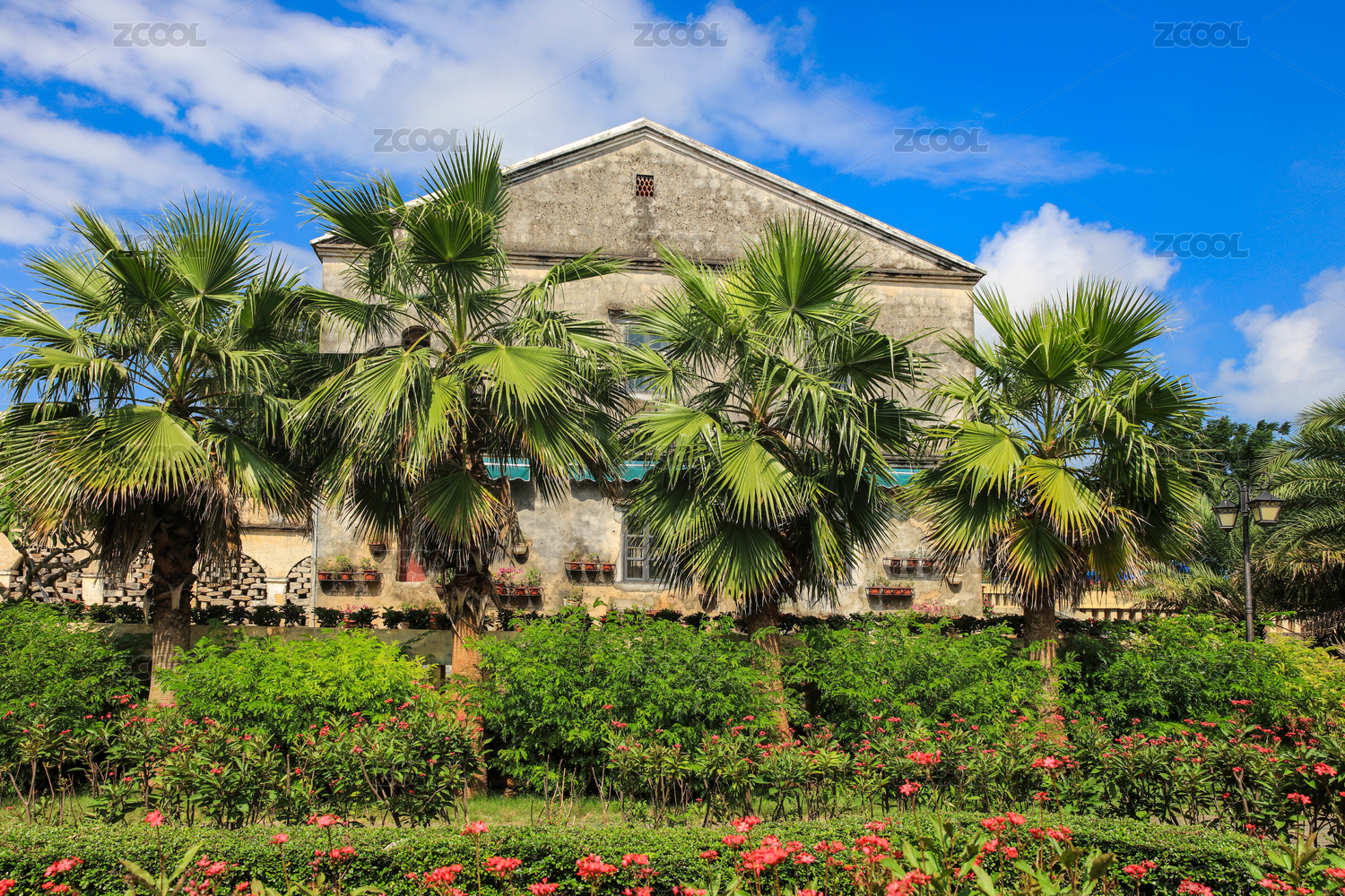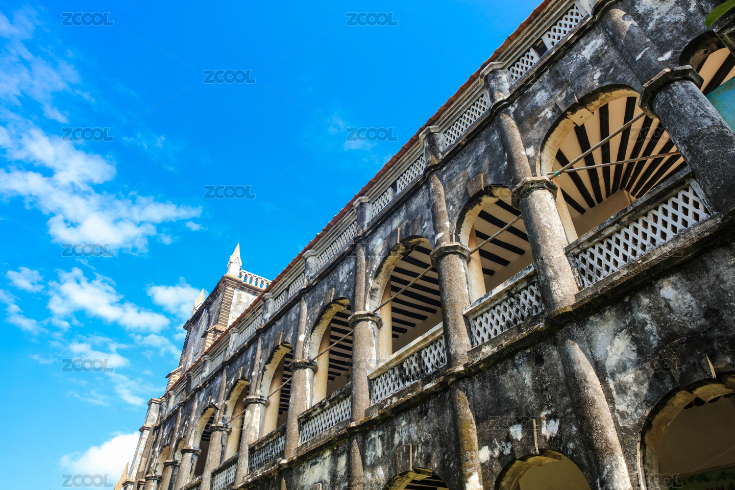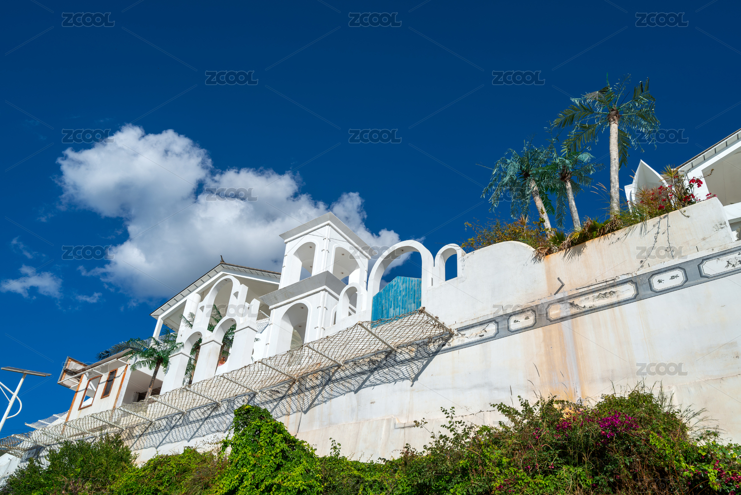 白色建筑映衬蓝天白云,阳光笼罩下倒映在泳