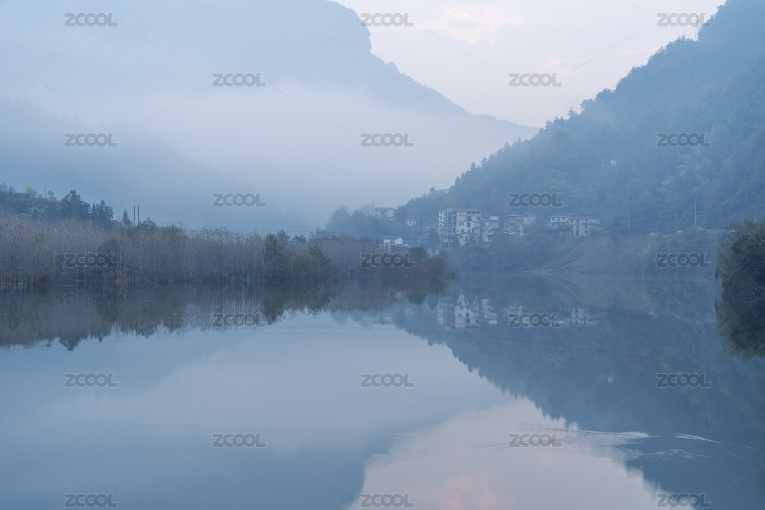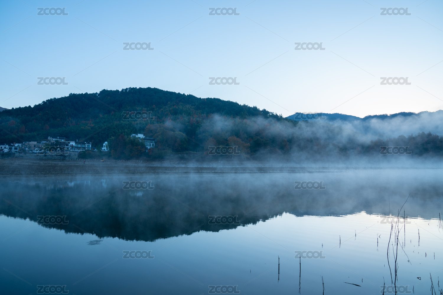 安徽省黄山市黟县宏村奇墅湖日出晨雾风光