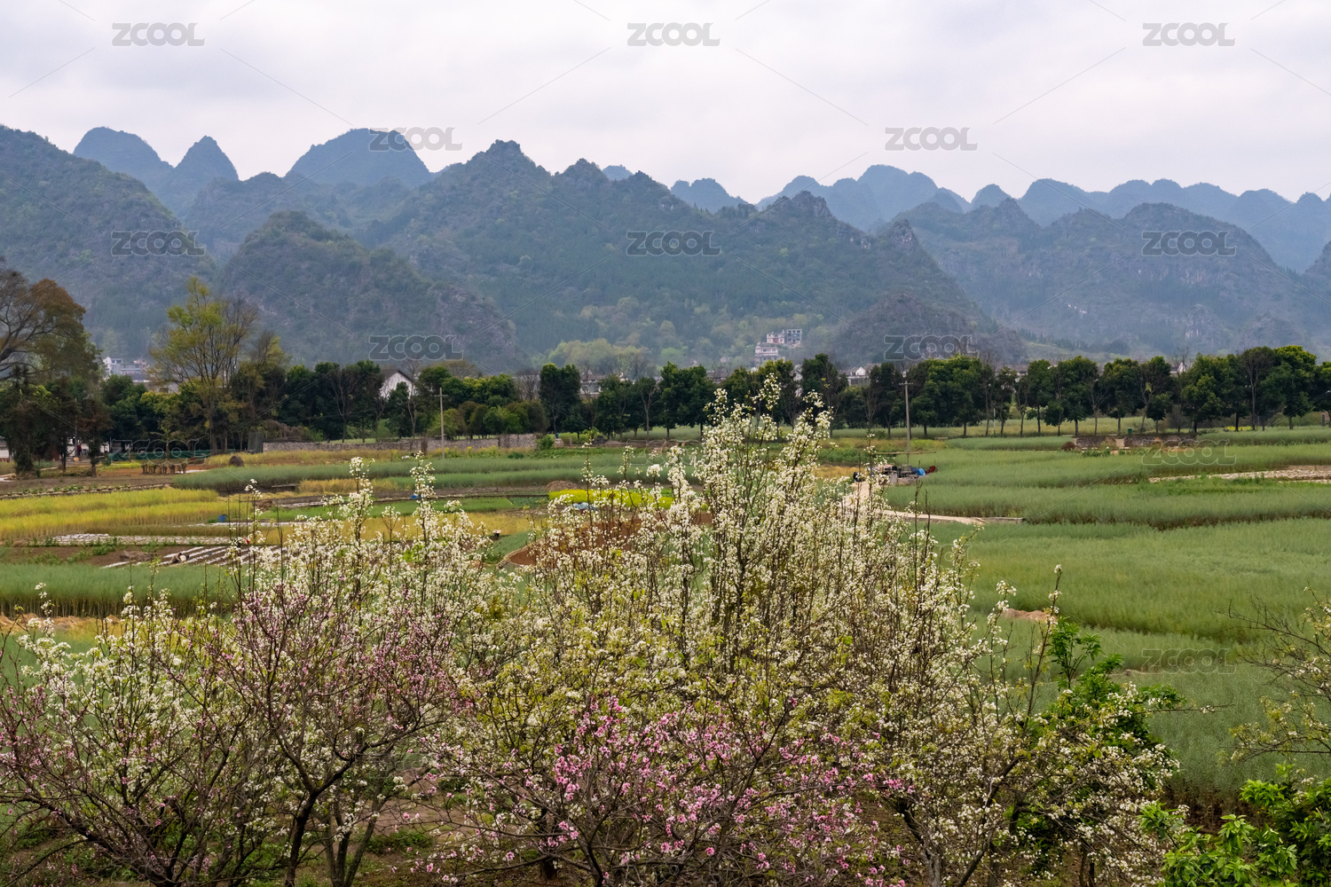 初春时分的大山为背景的广西柳州鹿寨县山区柑桔园