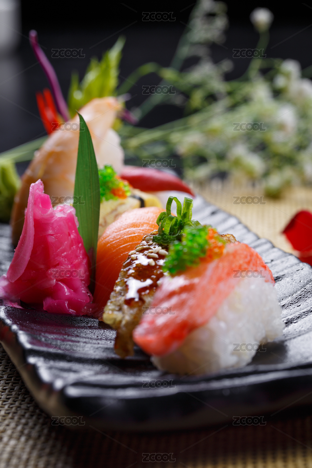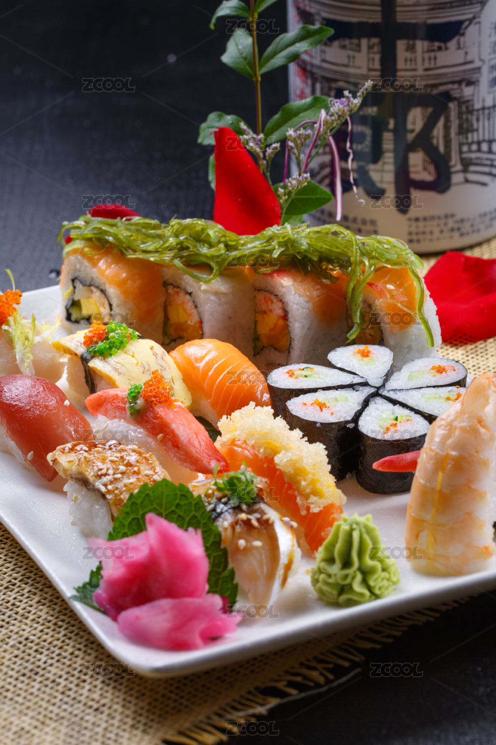 长方形白瓷盘装的豪华寿司拼盘摆放在草垫上