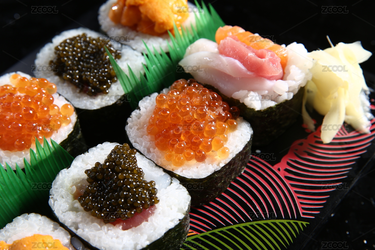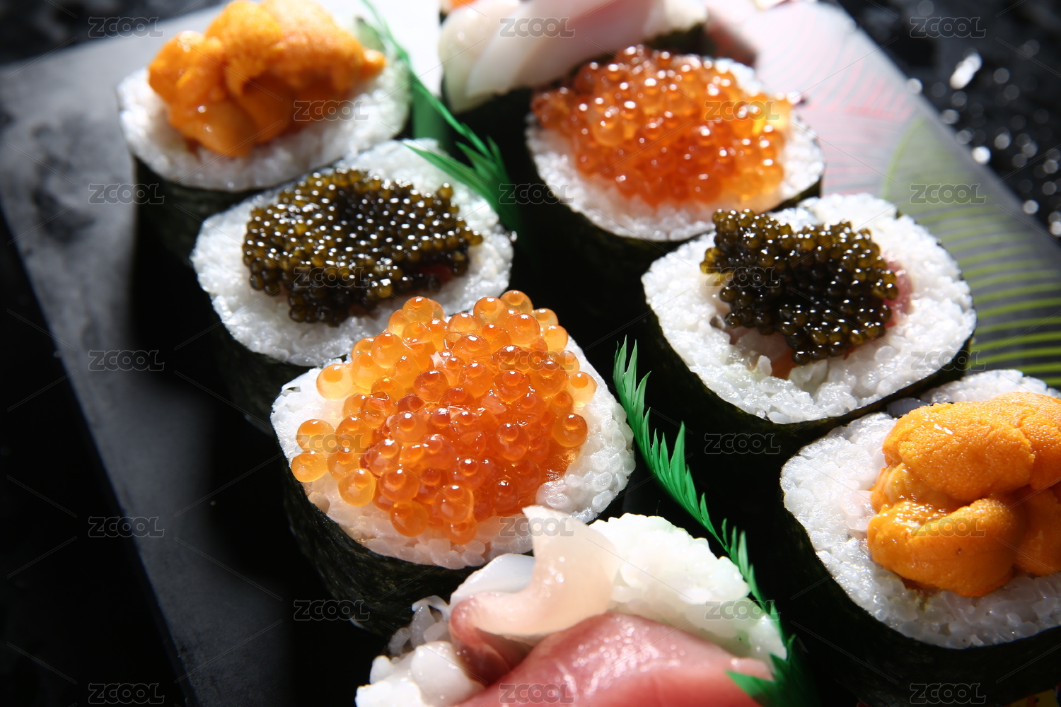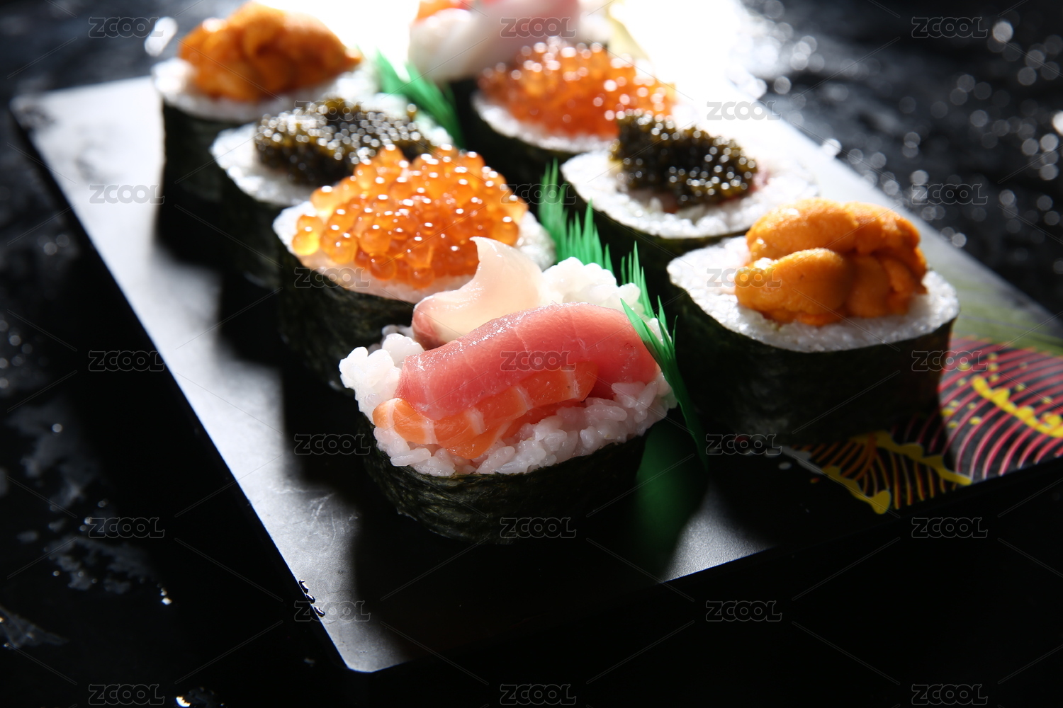 深色背景下的多种口味的寿司拼盘