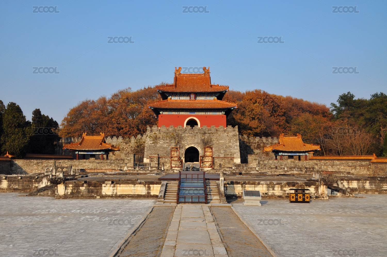 南京钟山风景区明孝陵秋天的树木和建筑入口