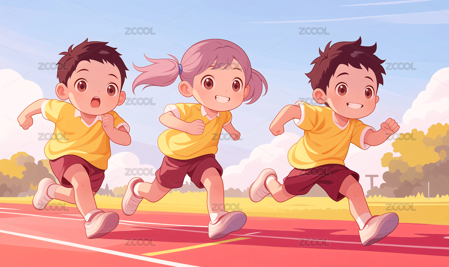 三个学生在操场上跑步