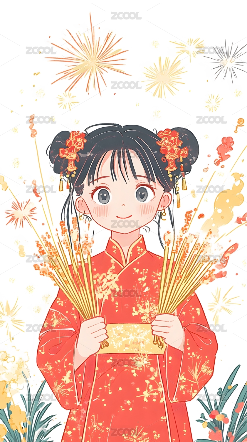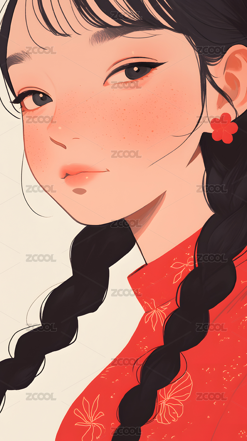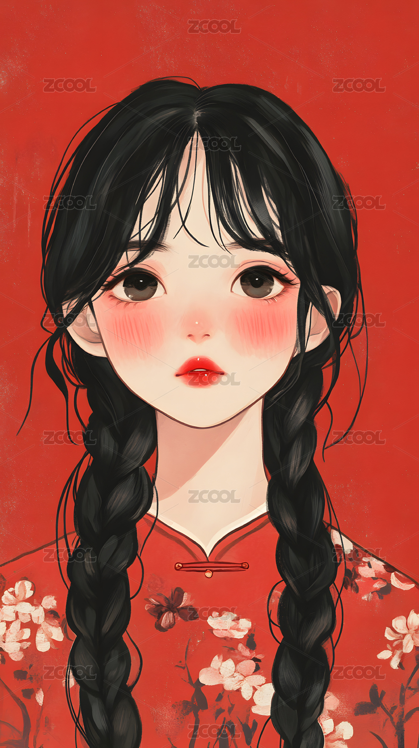手绘卡通可爱的穿着红色唐装的女孩插画