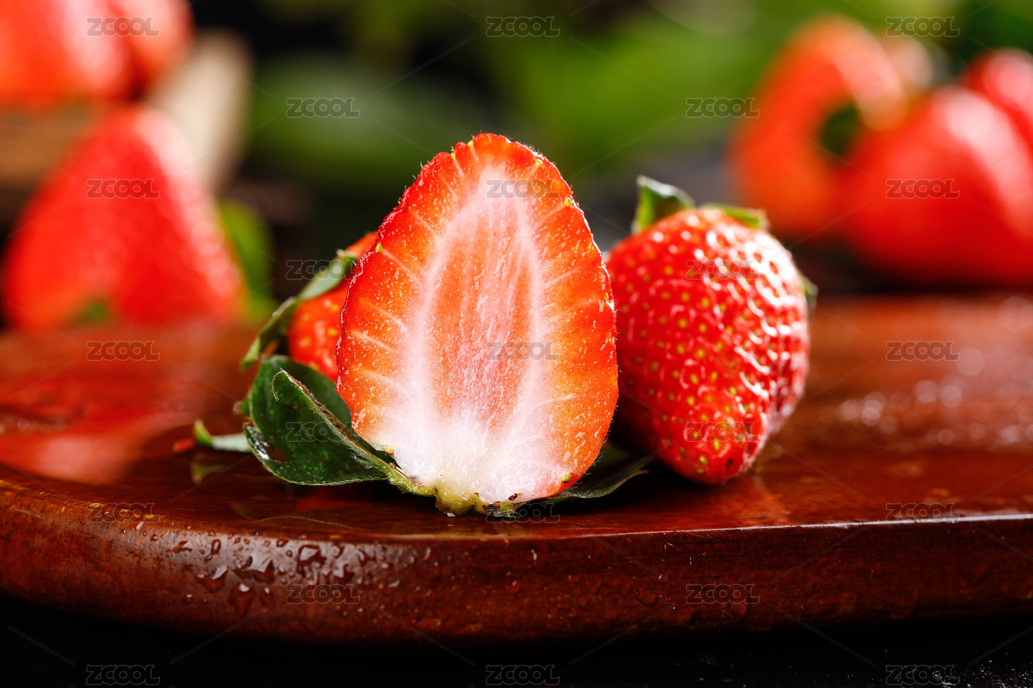 木底上放着红颜草莓和半边切面的草莓