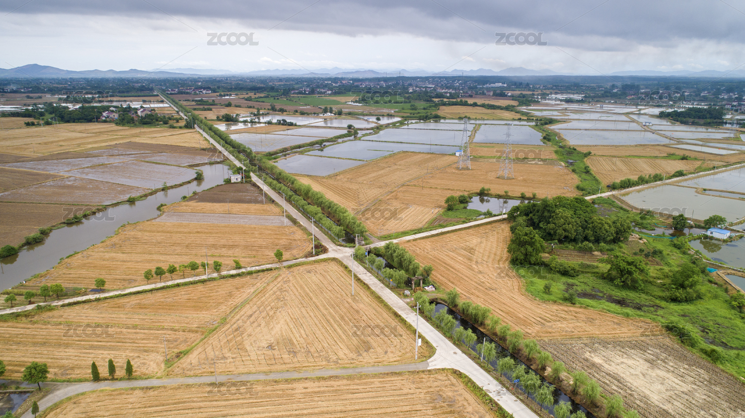 航拍中国安徽省宣城市收割后的田园风光