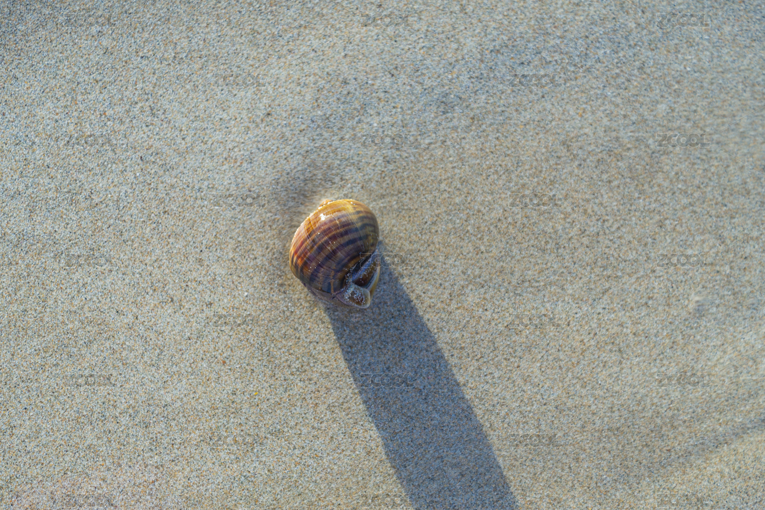 金黄色沙滩上退潮后留下的贝壳和水痕