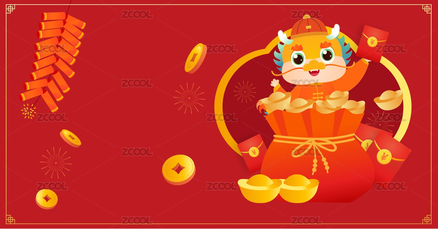 国潮新年龙年一只龙抱着元宝一只龙拿着红包