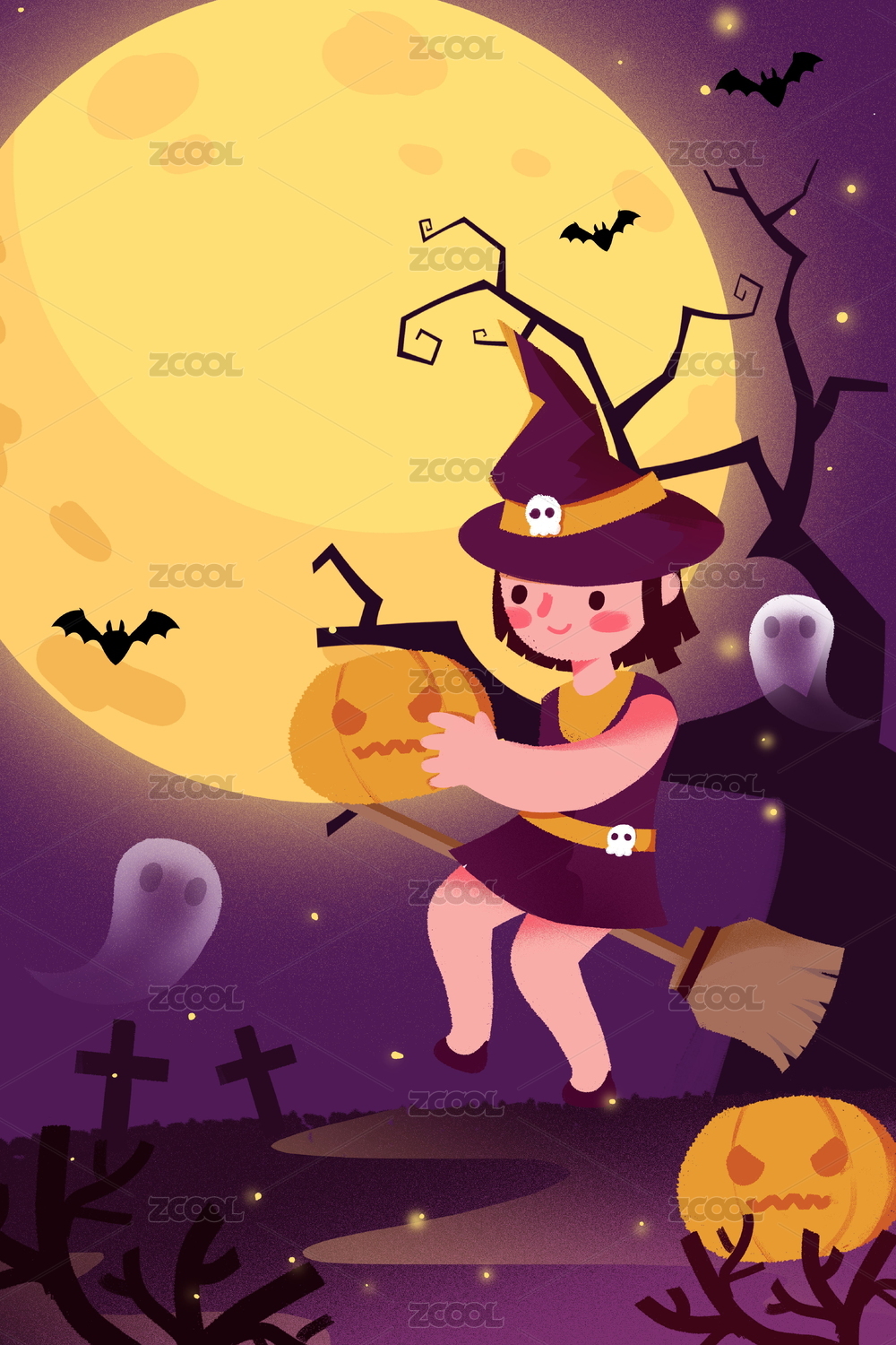 卡通手绘万圣节鬼怪巫婆闪屏插画