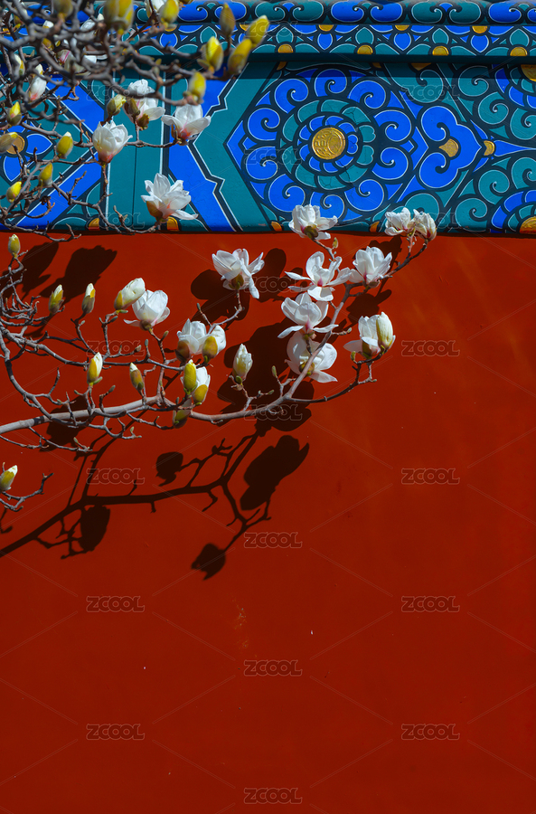 朱红色宫墙边的粉色玉兰花,中国广东潮州