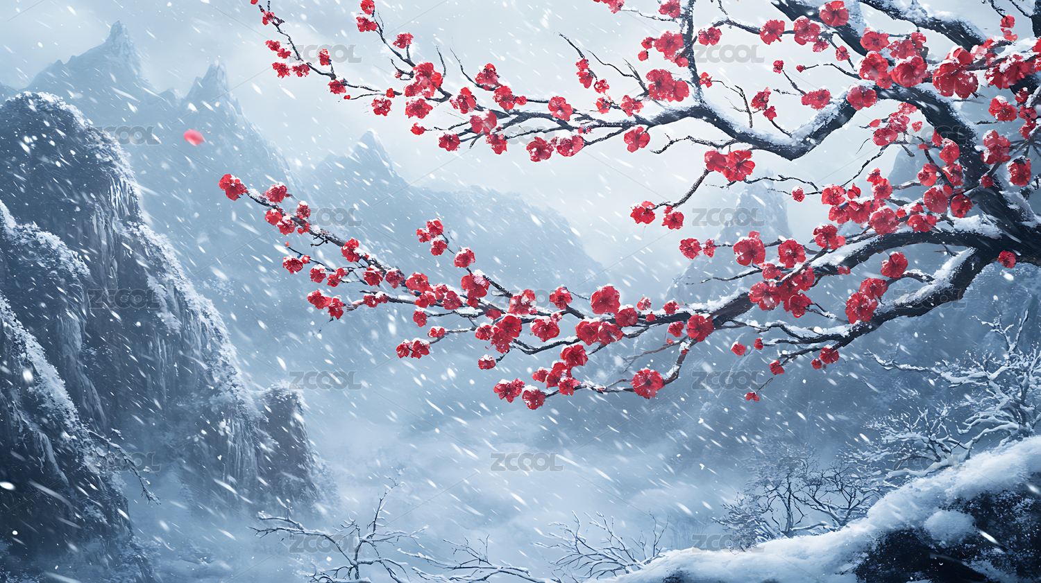 冬天山间雪中的红梅