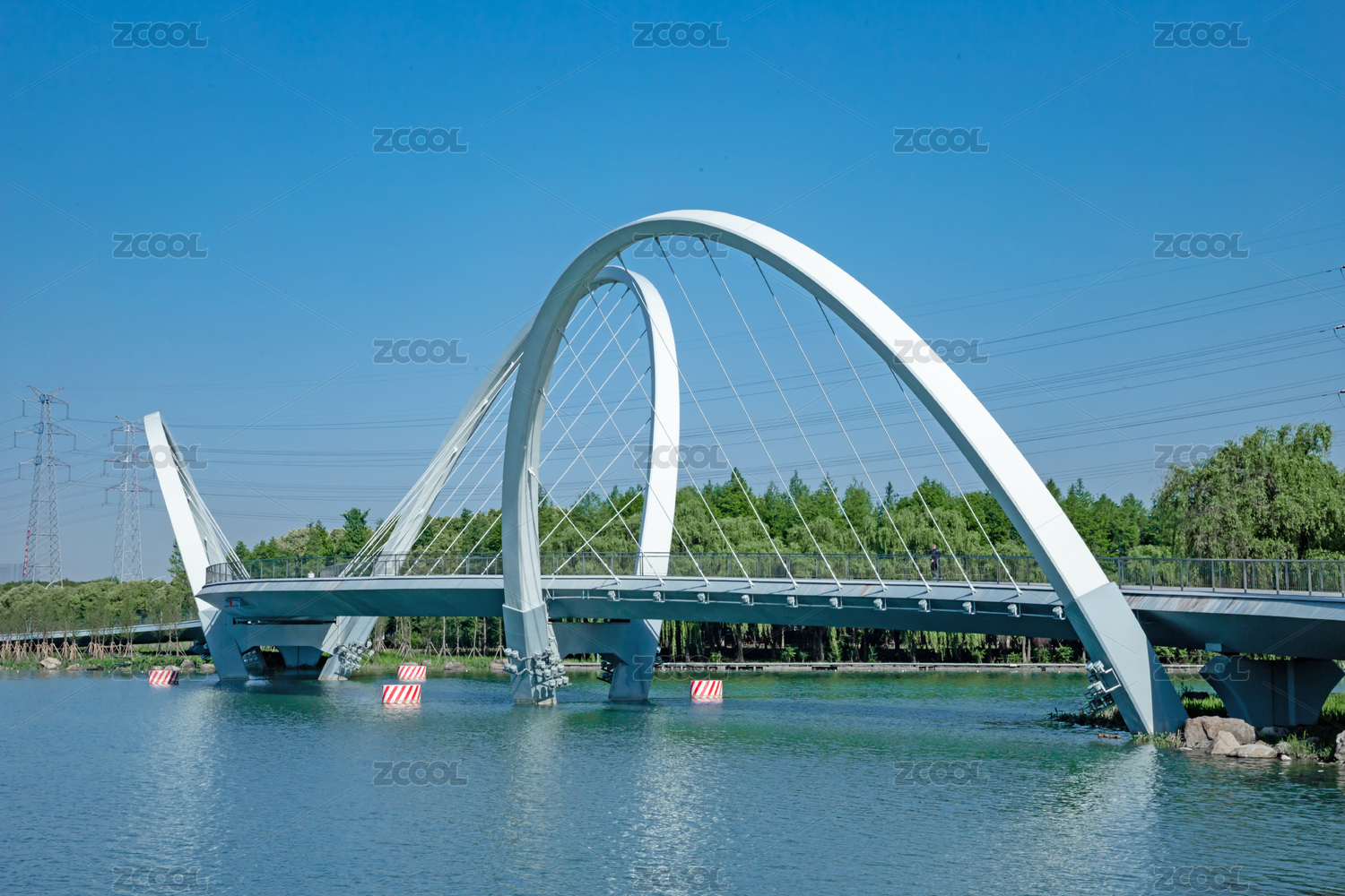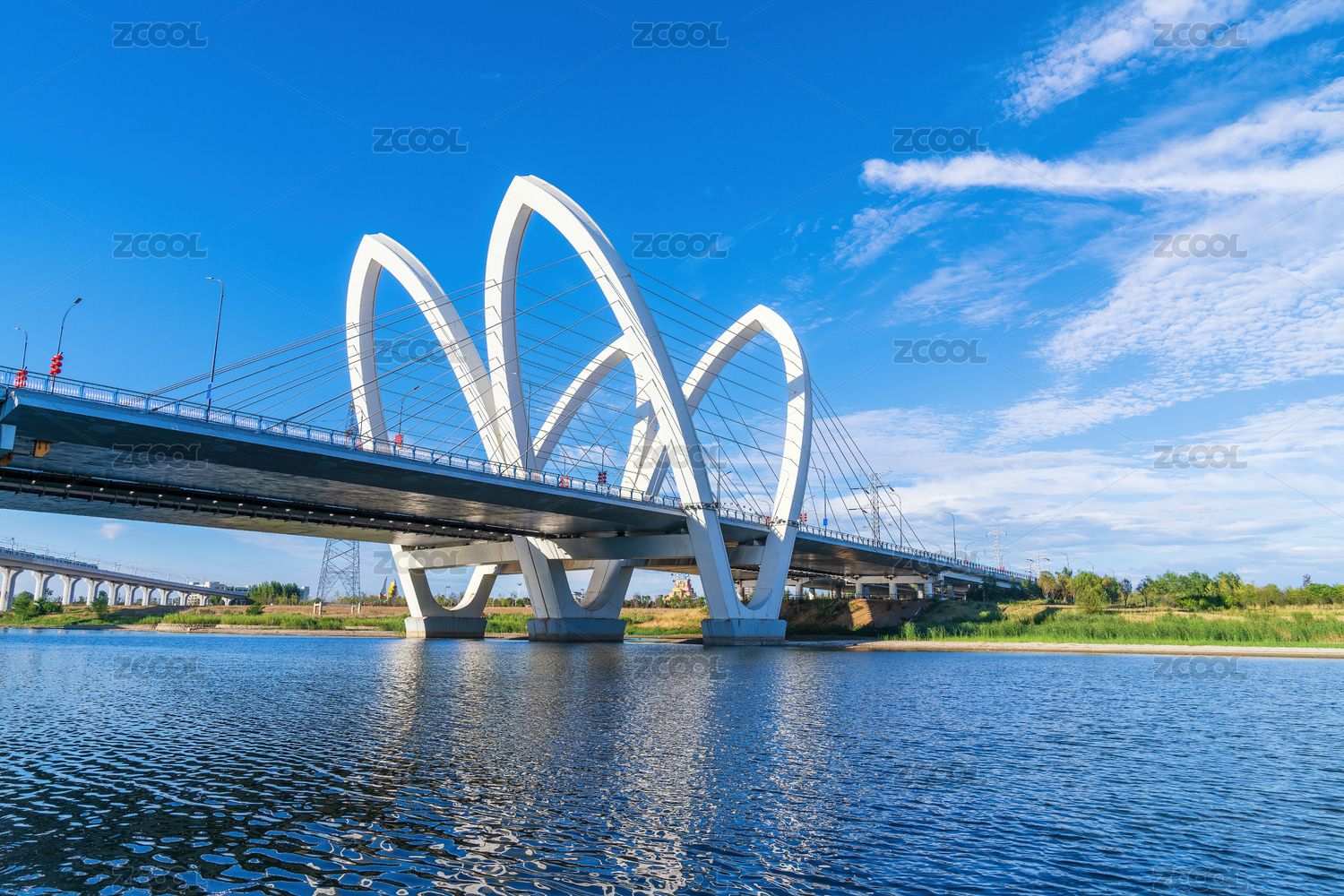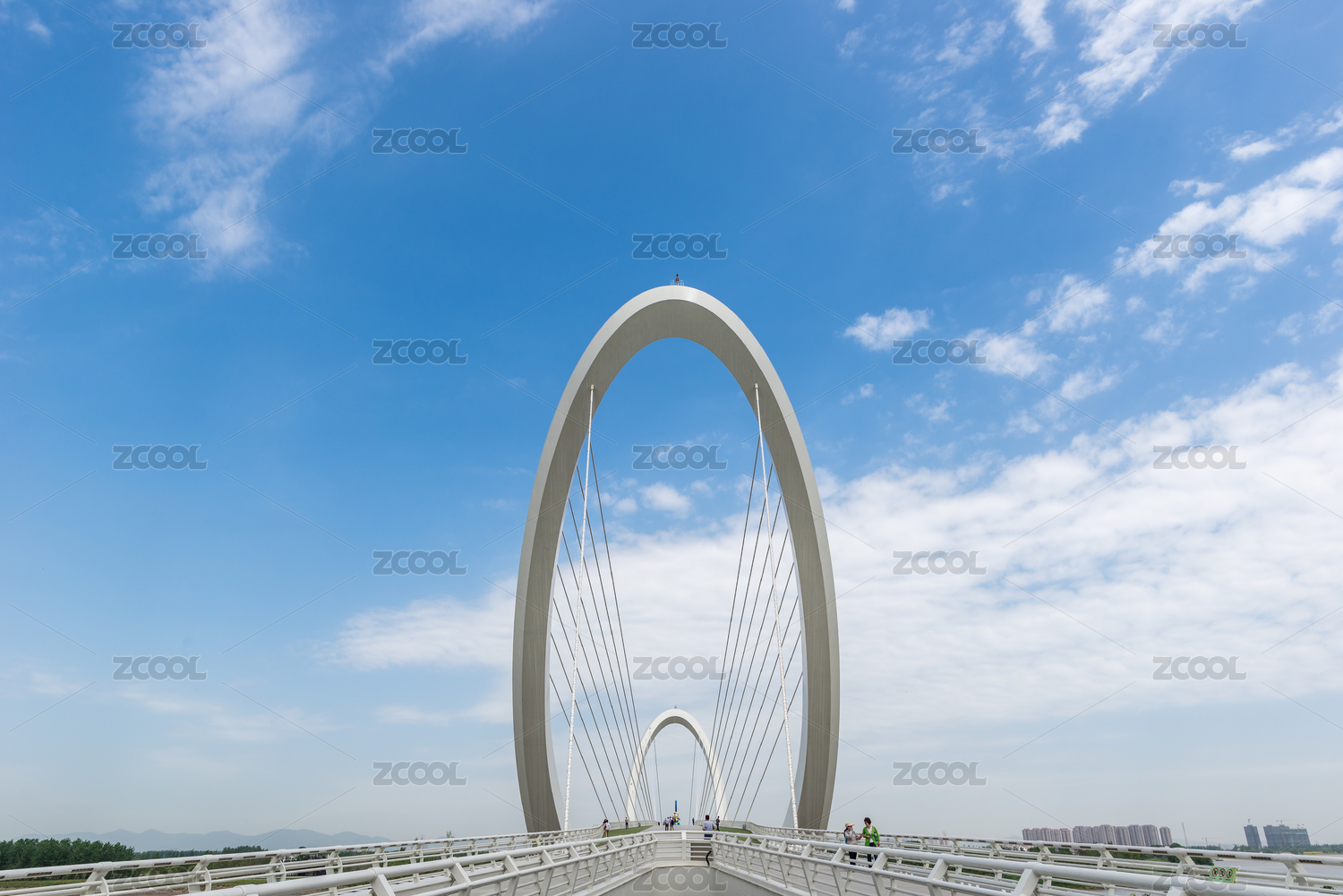 江苏南京蓝天下跨越河流的白色蝴蝶外形桥梁