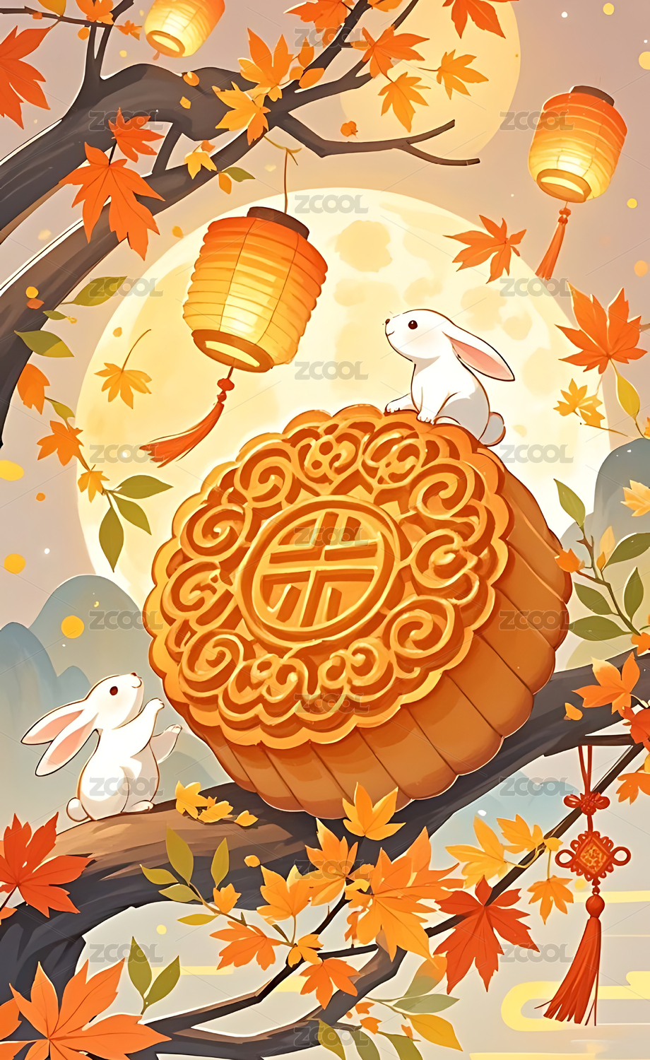 中秋节桂花兔子灯笼皓月扁平竖版矢量图插画