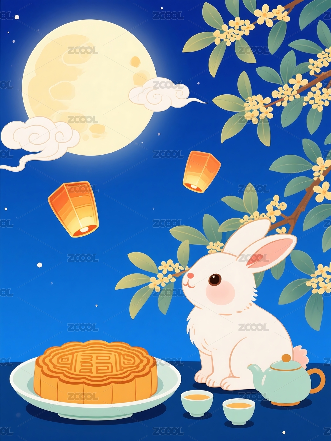 中秋节桂花兔子灯笼皓月扁平矢量图插画