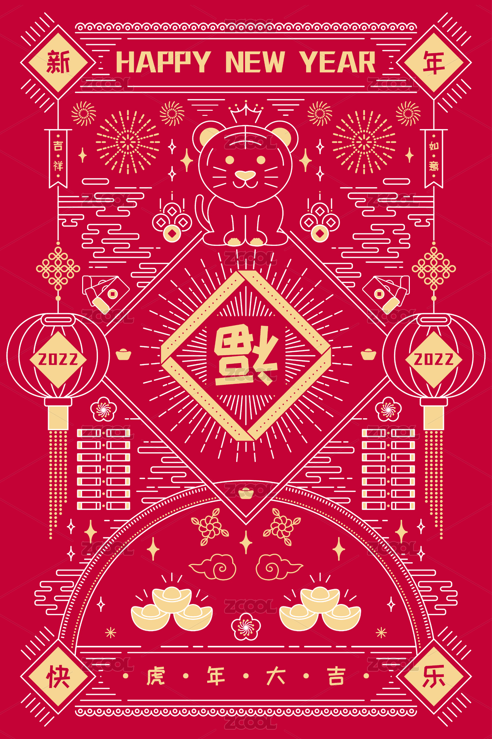 虎年新年红色海报老虎灯笼烟花鞭炮线性国潮
