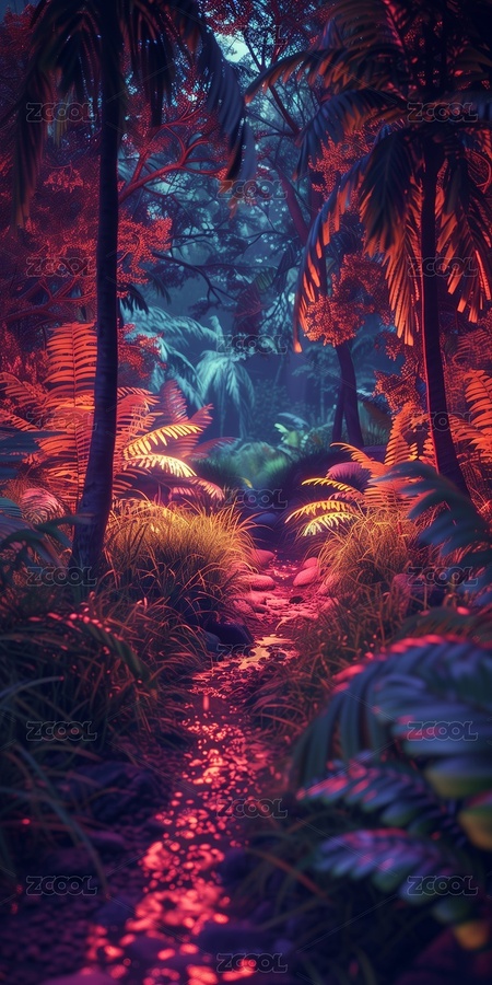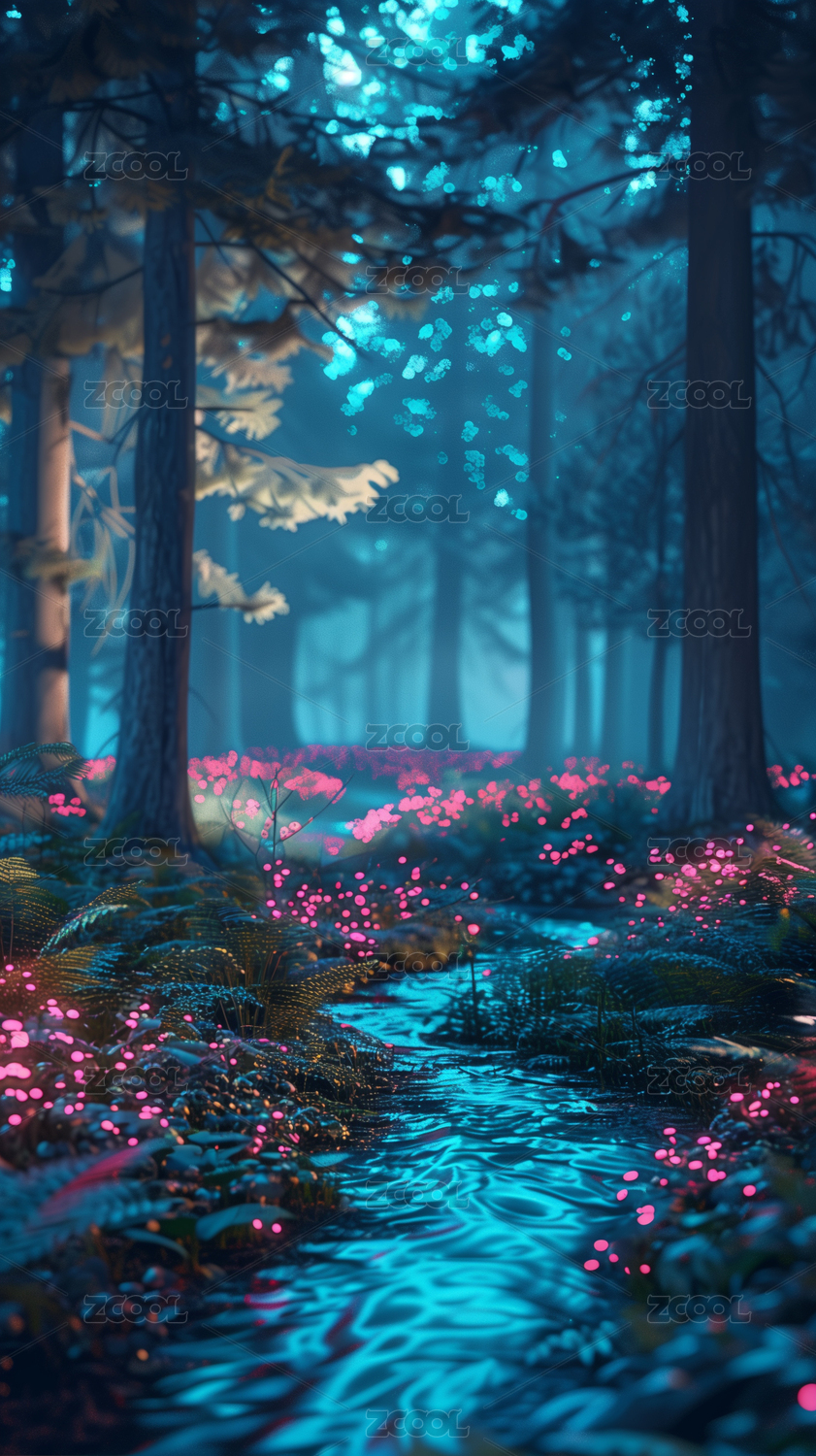梦幻荧光色幽静有溪水的树林森林插画绘画