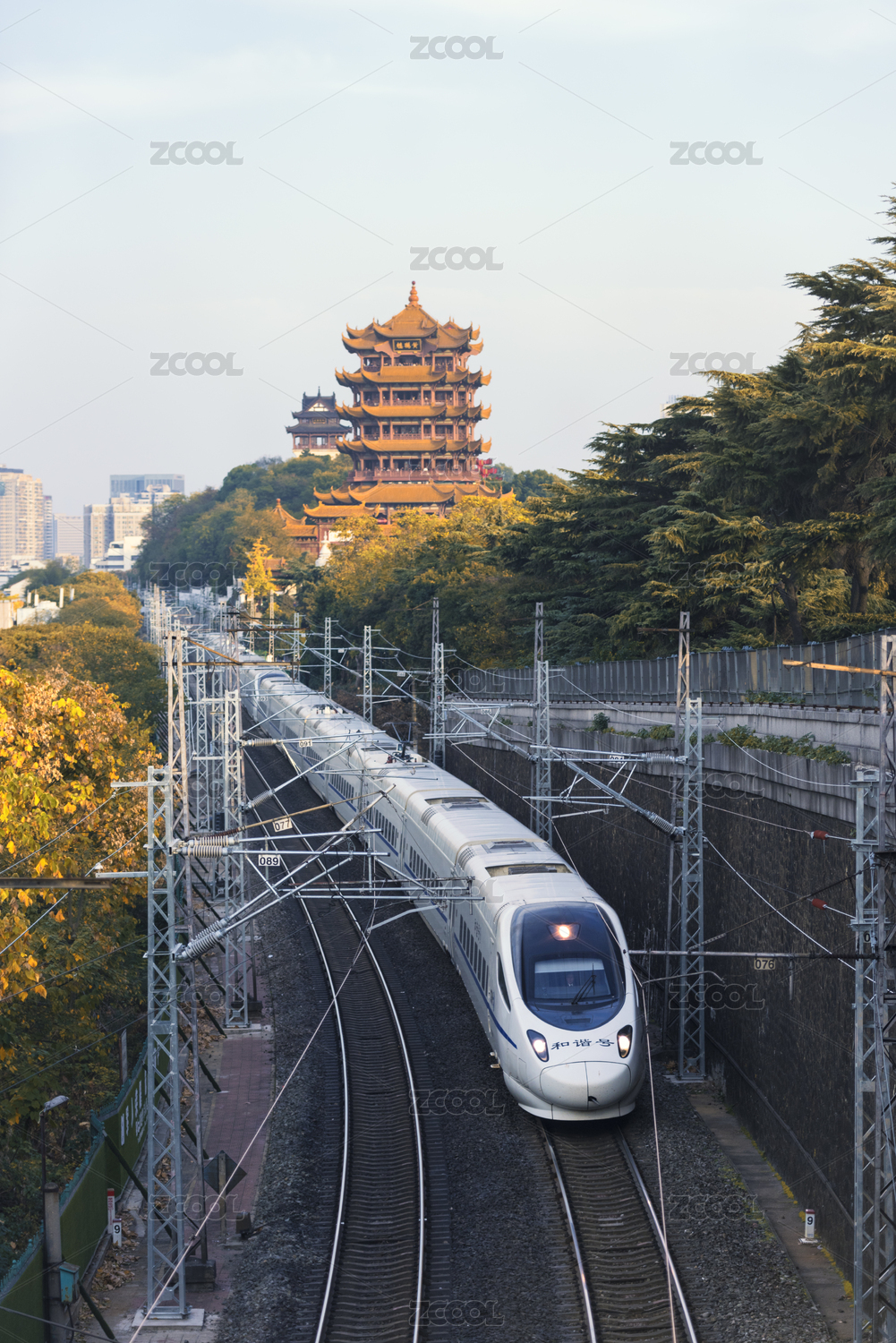 清晨的湖北武汉武昌黄鹤楼白云阁京广铁路线
