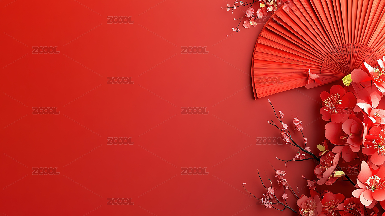 红色背景中的折扇和鲜花
