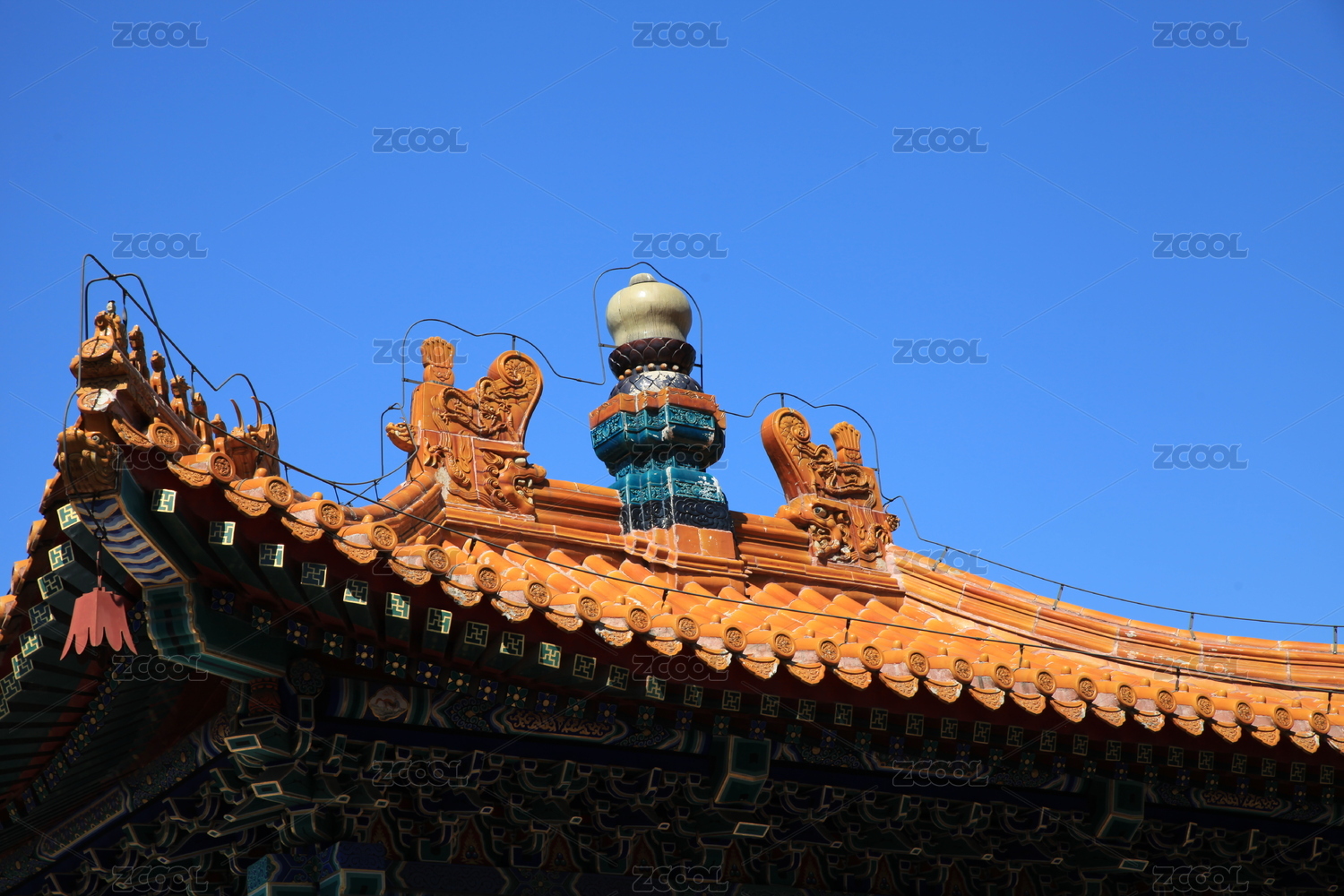 中国北京故宫博物院古建一角——琉璃瓦屋顶飞檐瑞兽