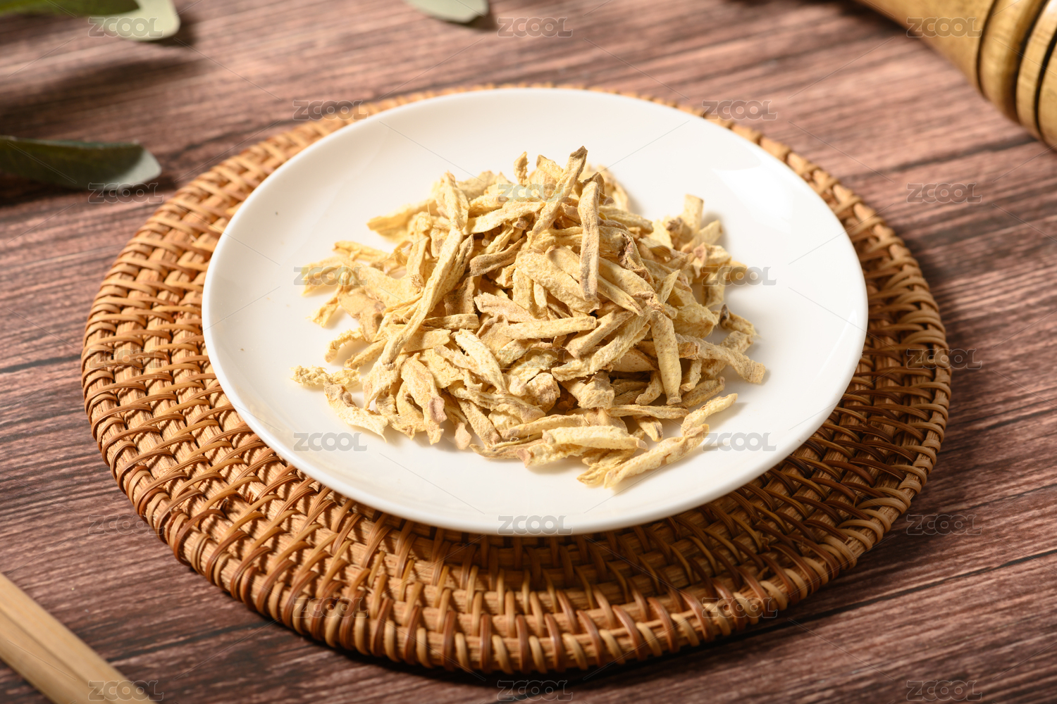 桌面上的盘子里的对身体有益的姜丝干