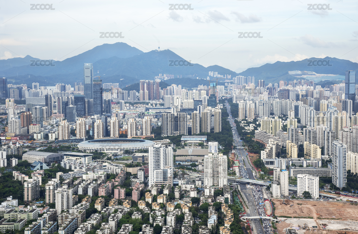 蓝天白云下的中国广东省深圳城市建筑群天际线风光