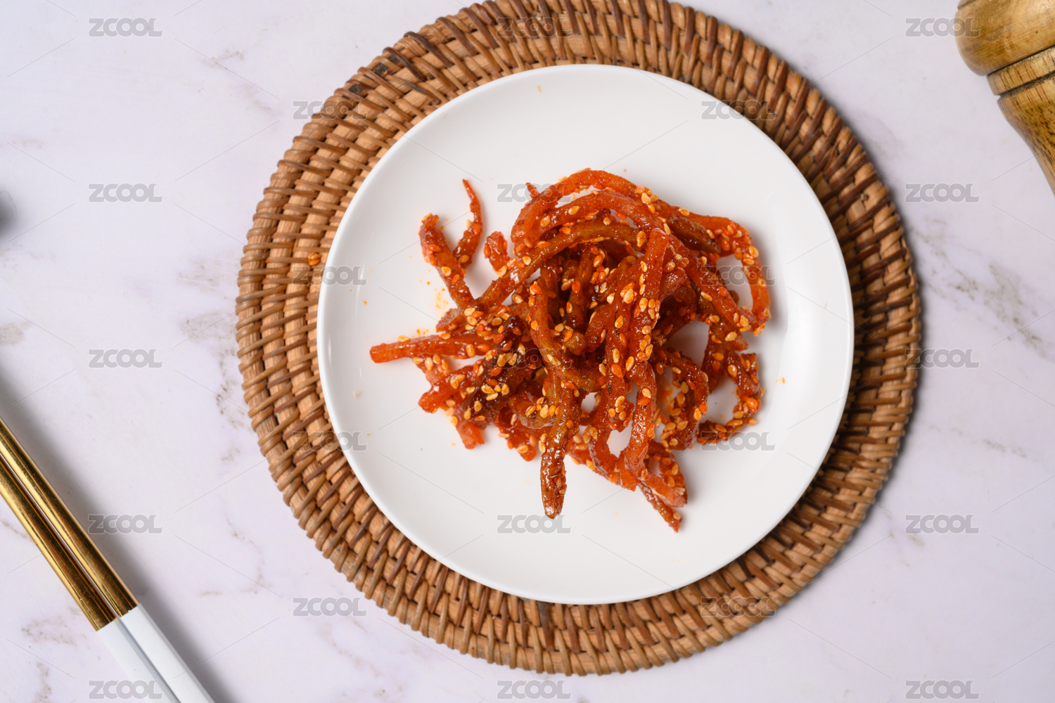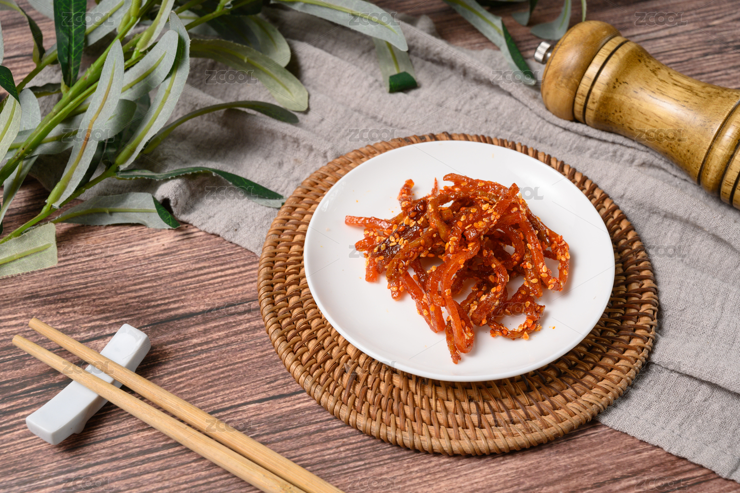 桌面上盘子里的美味可口的麻辣鳗鱼丝